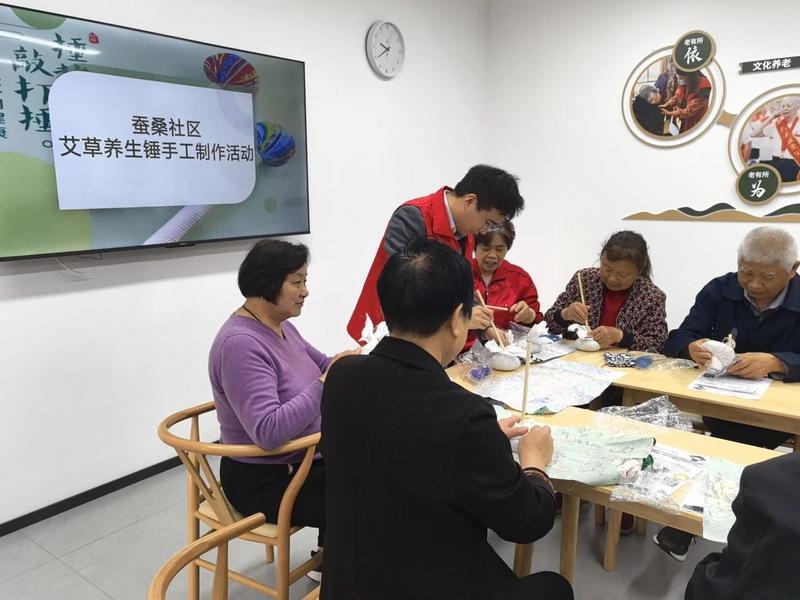随后,工作人员为时间银行的老人们带来了一场艾草锤制作活动。工作人员首先向老人们介绍了艾草锤的功效和用途,如缓解关节疼痛、促进血液循环等。接着,详细讲解了艾草锤的制作方法和步骤,并分发了制作所需的材料和工具。老人们纷纷动手尝试,大家互相交流学习,共同享受着制作的乐趣。