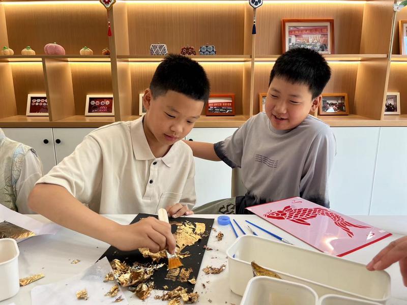金箔画制作环节同样吸引了小朋友们的目光。活动现场,老师向小朋友们介绍了非遗烧箔画的历史、艺术风格及制作工艺,并进行了现场示范。在老师的指导下,小朋友们亲手体验了烧箔画的制作,创作出了一幅幅充满创意的作品。