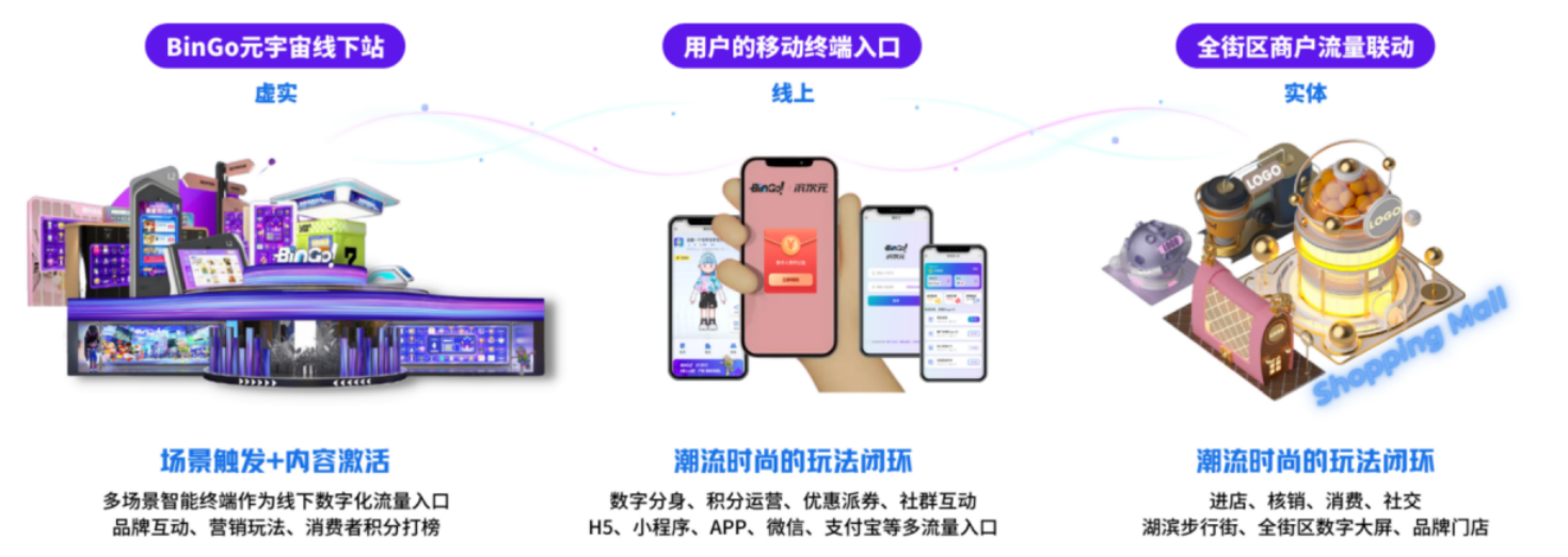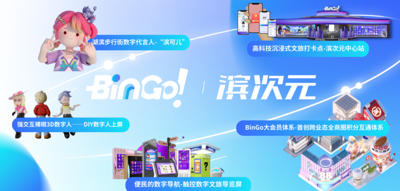 2023年,湖滨商圈推出了全国首个集“社交、消费、互动体验”于一体的“BinGo滨次元线上元宇宙虚拟街区”。为商圈消费者呈现众多新业态、新模式、新场景,打造虚实相融的数字社会形态,让消费者体验到了更加智能、便捷、安全的元宇宙消费体验。