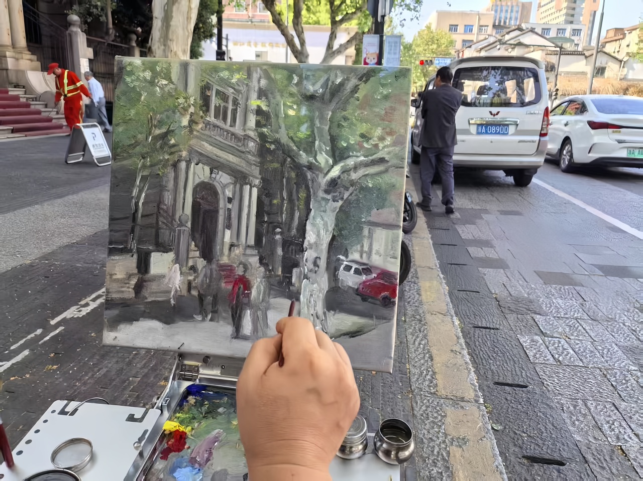 漫步在中山中路上,你还能看见许多油画爱好者在街头巷尾穿梭踩点,他们用画笔捕捉市井生活的点滴,纵横交错的三元坊巷、古典气派的浙江兴业银行旧址、憨态可掬的落叶猫、绿树成荫的小区……这里既有江南味道的历史感,也有时尚的城中精致生活,处处体现当地人们对幸福生活的向往与追求。