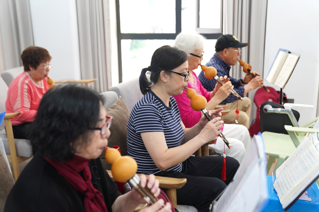 75岁的王丽莉是这支乐队的队长。退休后,闲不住的她在老年大学学习了葫芦丝,积累了一些乐谱知识。平时在乐队的训练中,她总是耐心地教大家识谱、数拍子,将自己所学毫无保留地传授给大家。不少学员也都愿意花费1个小时以上的路程赶来学习,从最初对葫芦丝一知半解,到现在能熟练演奏好多曲目,学员们感慨道从学葫芦丝中收获了不少乐趣。