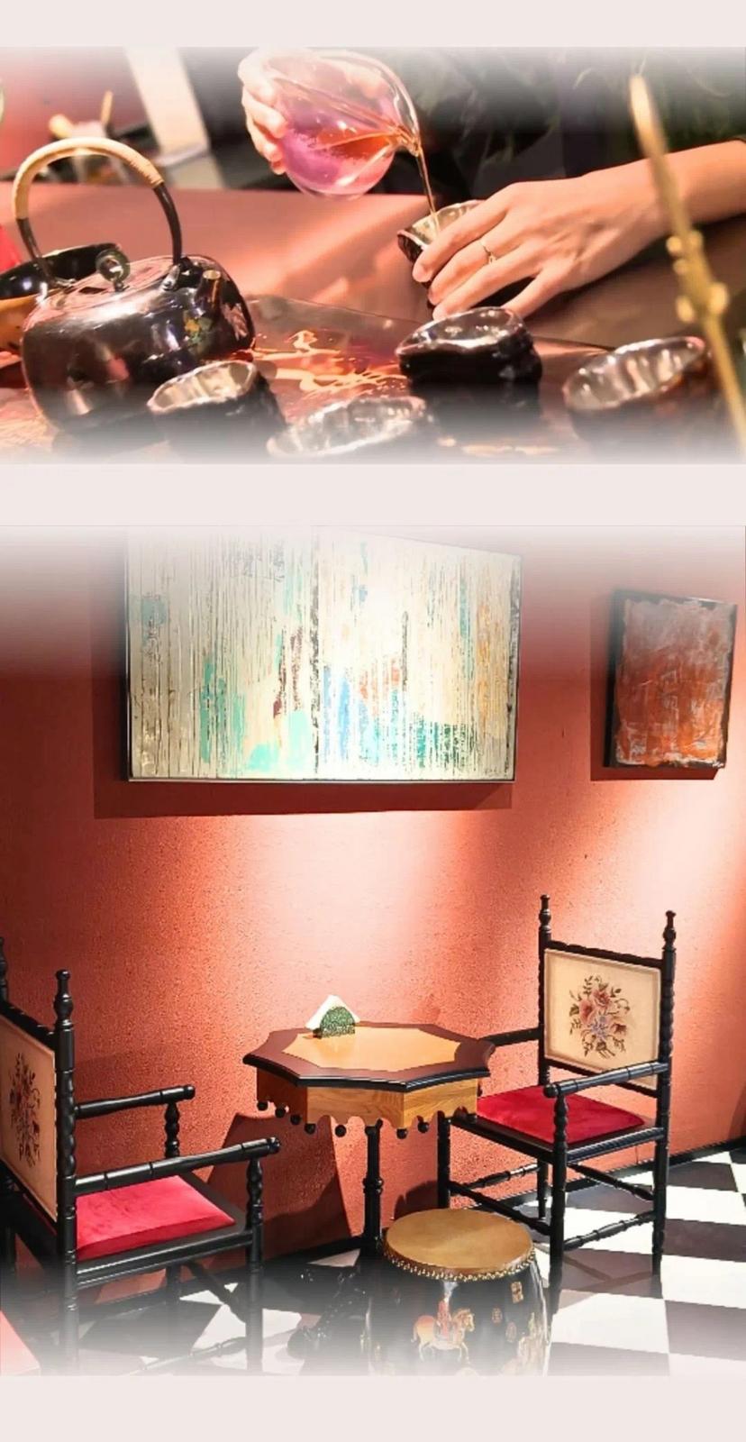 其中“非遗+茶庐”以丰富的色彩、古典的陈设,搭配各项非遗茶点、茶具、饰品等,大胆构建出充满东方韵味的艺术空间。而“彡巛亽(山川集)茶事空间”,则更像一个茶+手作的公社,其更加注重现代与简约的融合,采用简约的设计风格,搭配以现代艺术作品,如天然竹制品、木工精工作品、绿植盆栽等,为年轻人提供了一个时尚、舒适的品茶及社交环境。