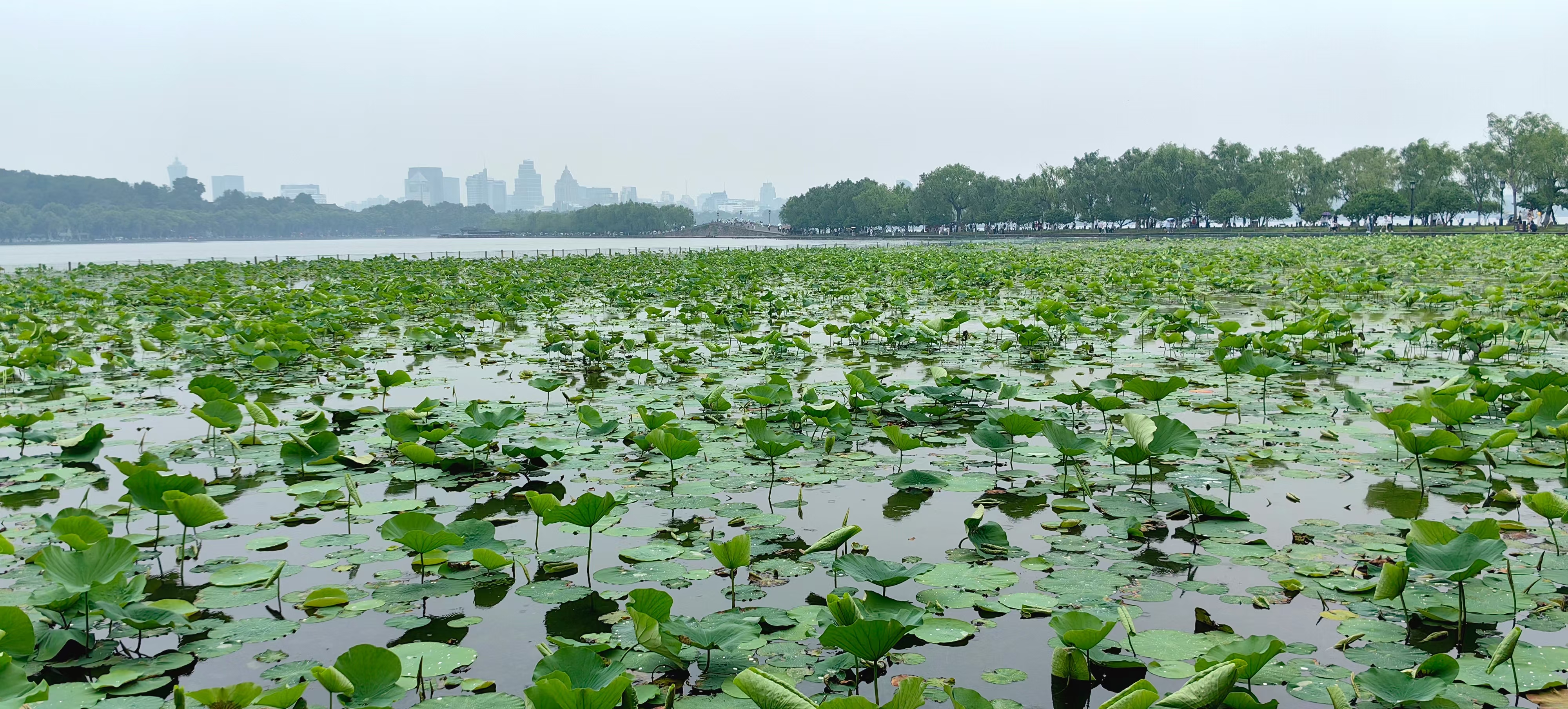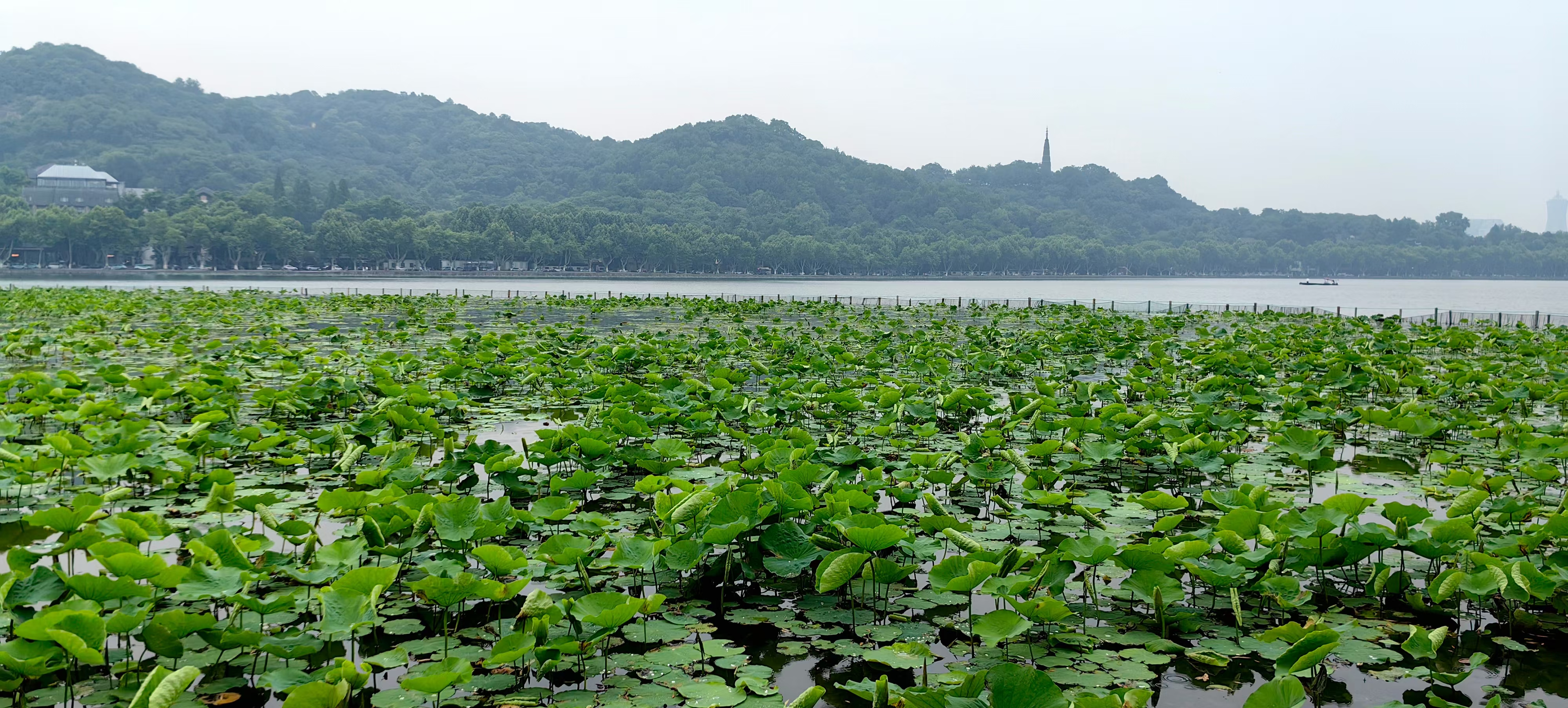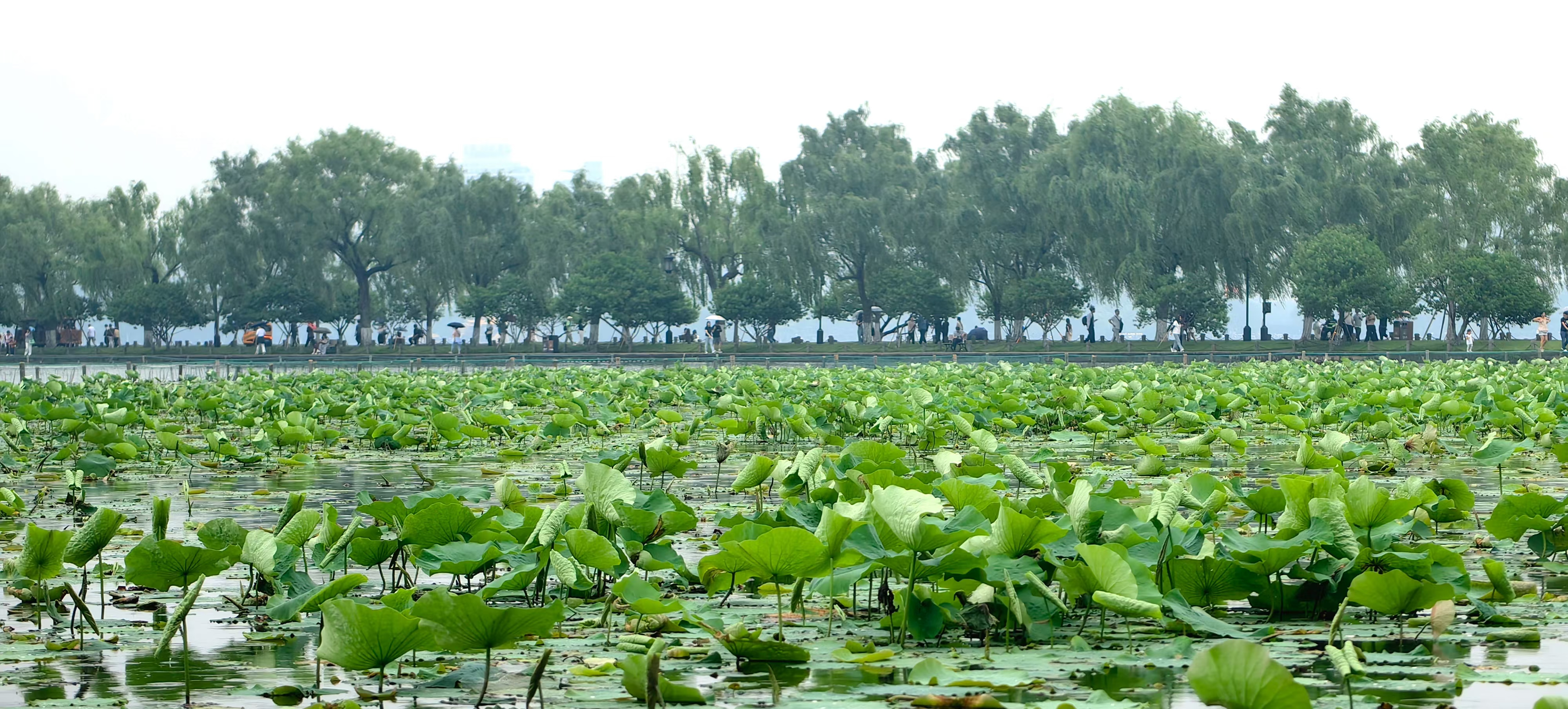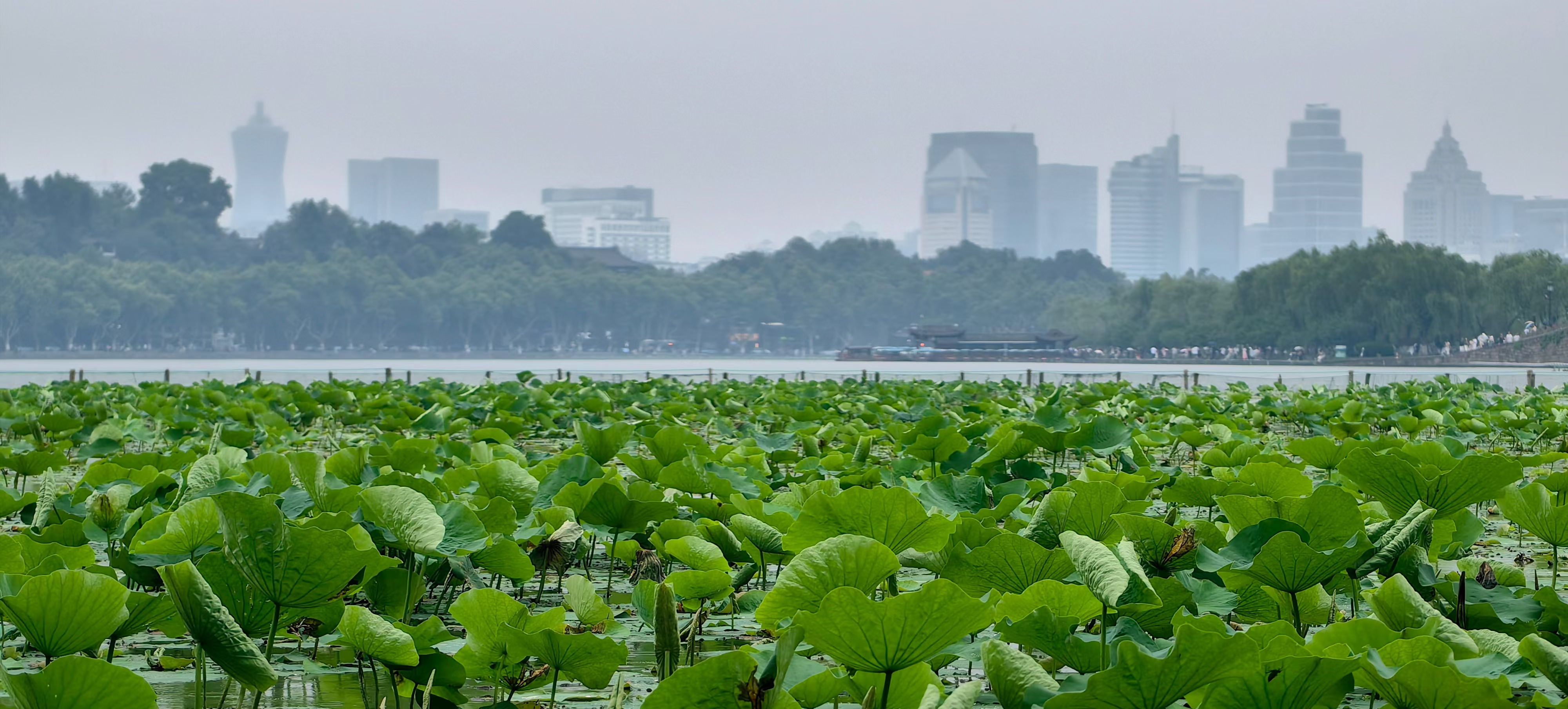 烟雨朦胧中,西湖宛如一幅水墨长卷徐徐展开。湖面上,大片大片的荷叶肆意铺陈,宛如翠绿色的圆盘。(2025年5月 西湖 江志清 摄)
