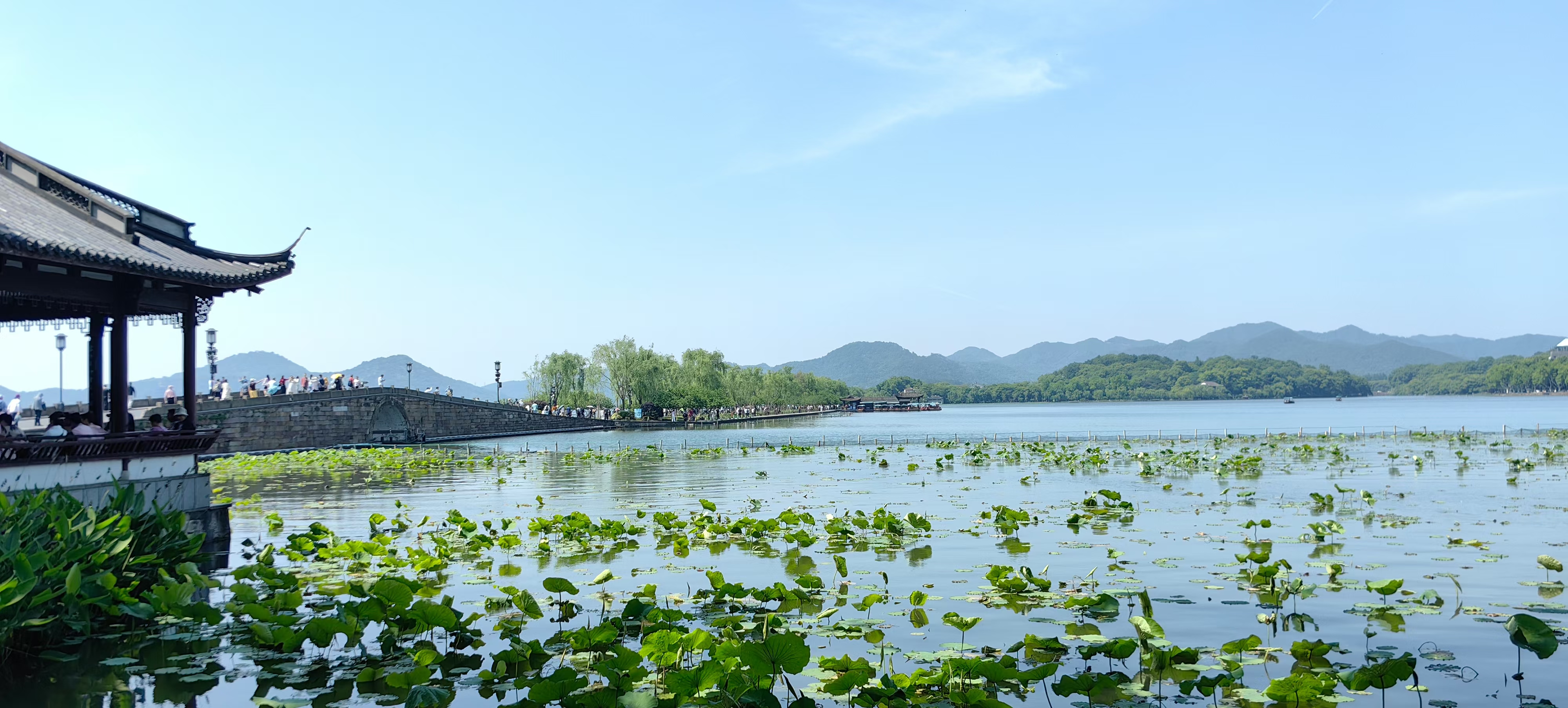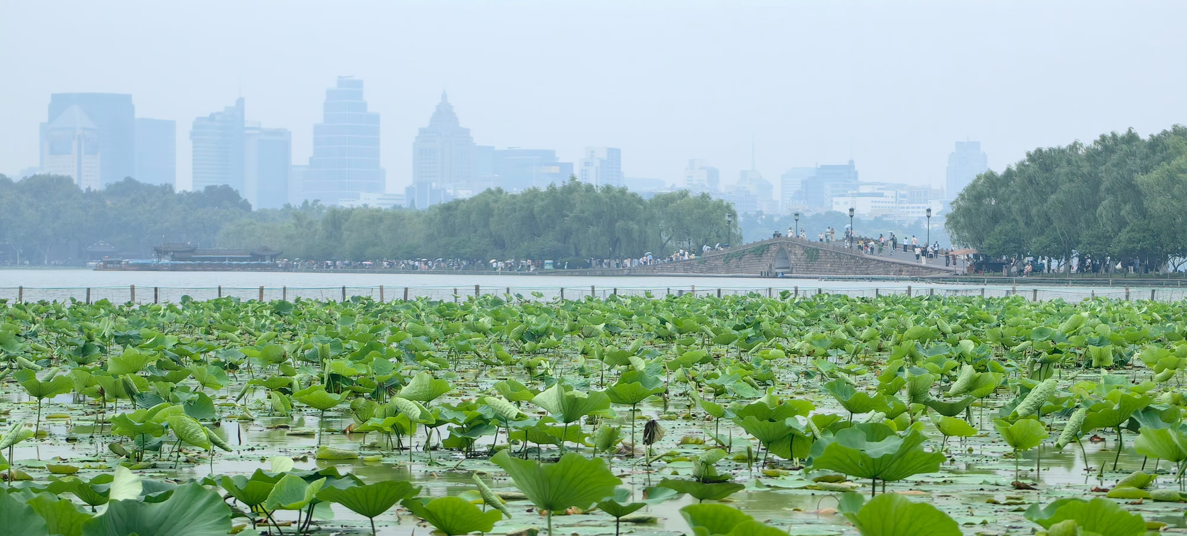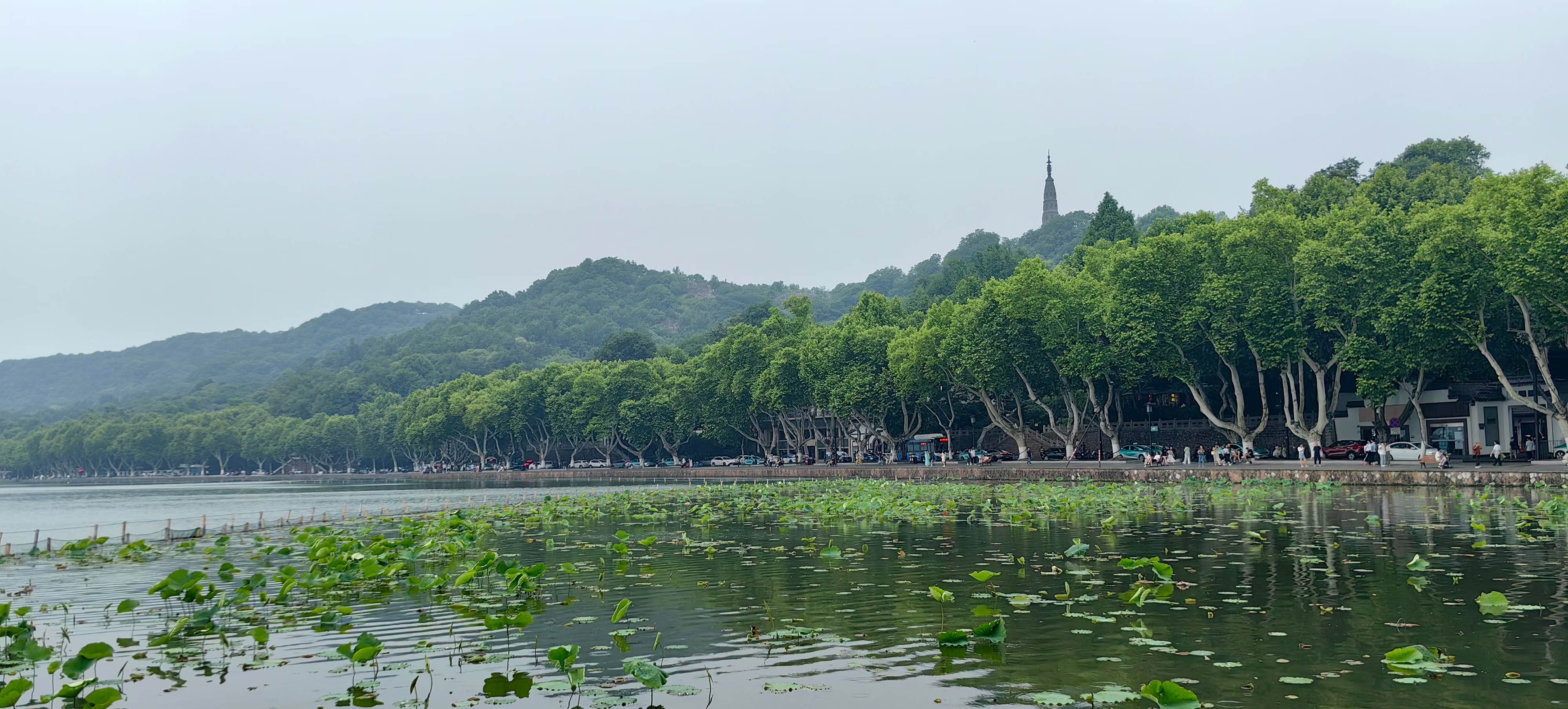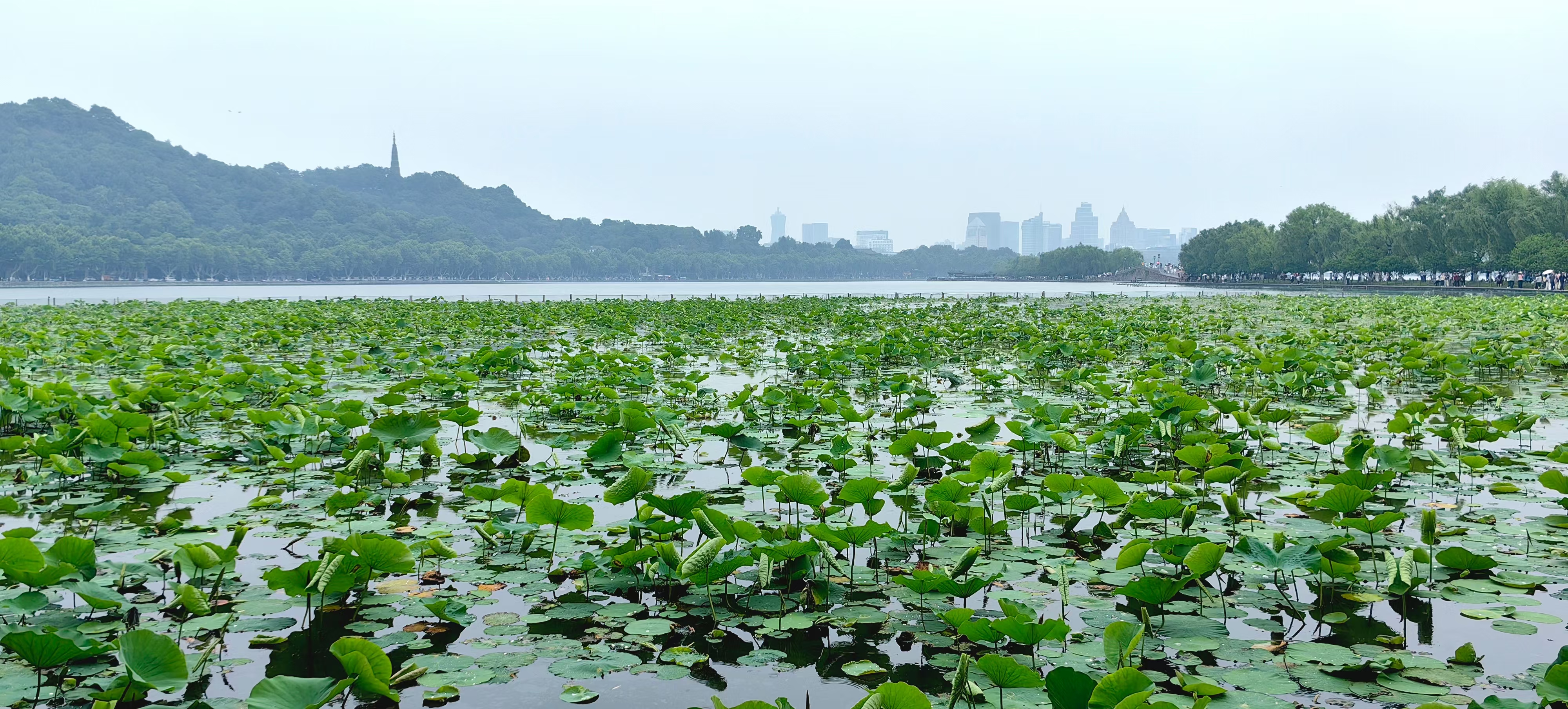 烟雨朦胧中,西湖宛如一幅水墨长卷徐徐展开。湖面上,大片大片的荷叶肆意铺陈,宛如翠绿色的圆盘。(2025年5月 西湖 江志清 摄)