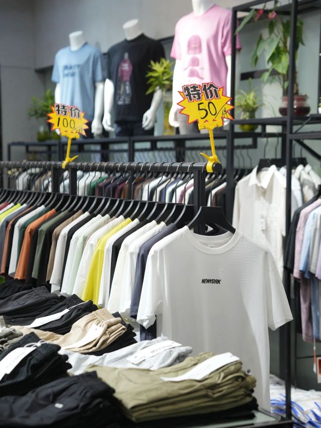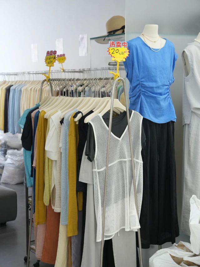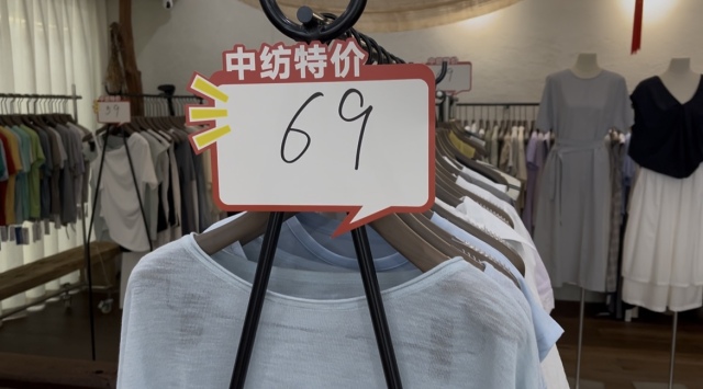 冰麻防晒长袖衫69元一件,基础款纯棉T恤被贴上“25元”的醒目红标,天丝吊带连衣裙从128元狠狠划至50元……走进中纺中心服装城SUMLE档口,价格牌上演“跳水”大戏。“店里所有衣服都参与特惠活动,随便挑,都是‘骨折’价!”老板娘刘梦随手抄起一件含羊毛的针织短袖,“30块一件,比成本还低。”