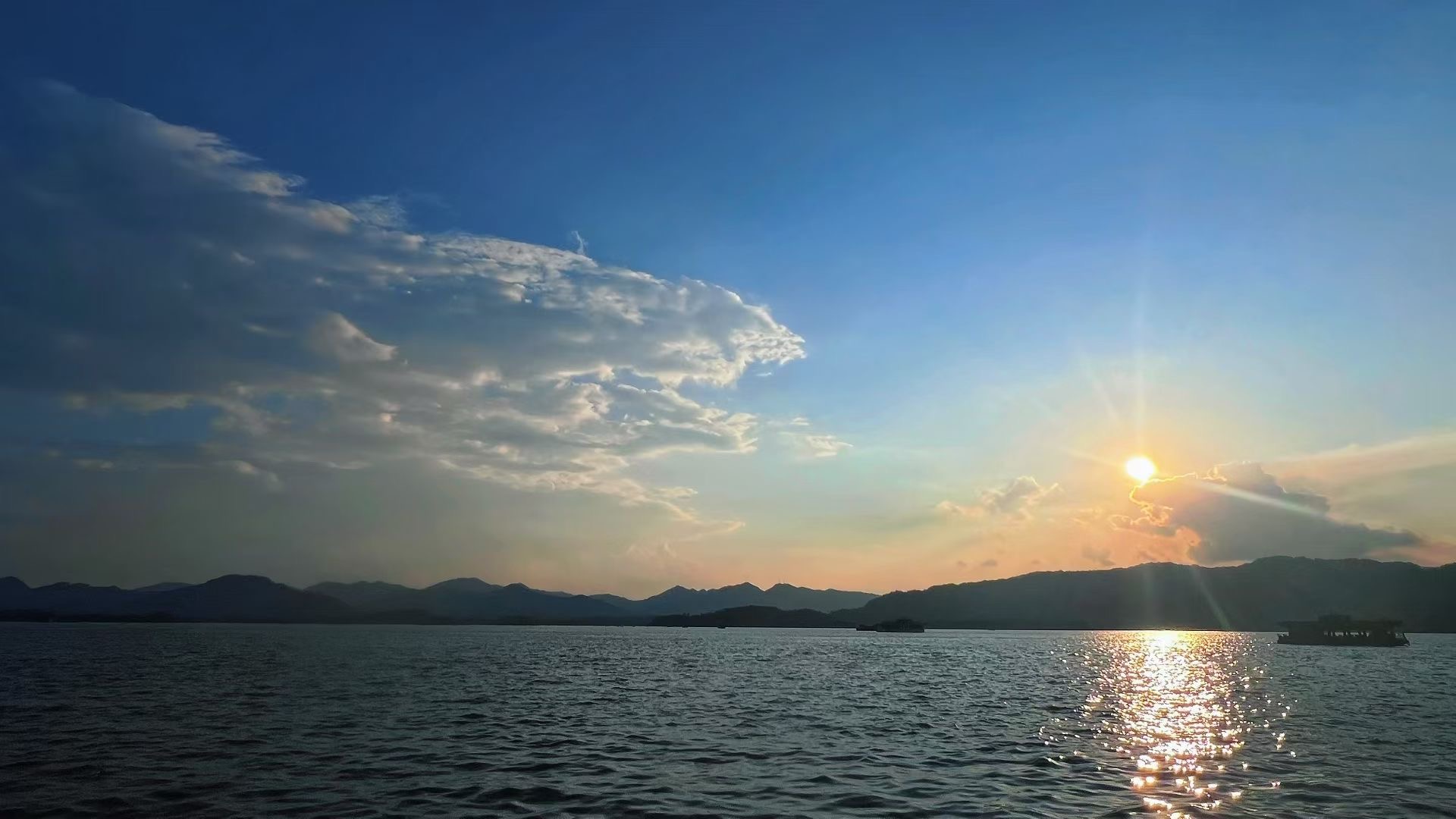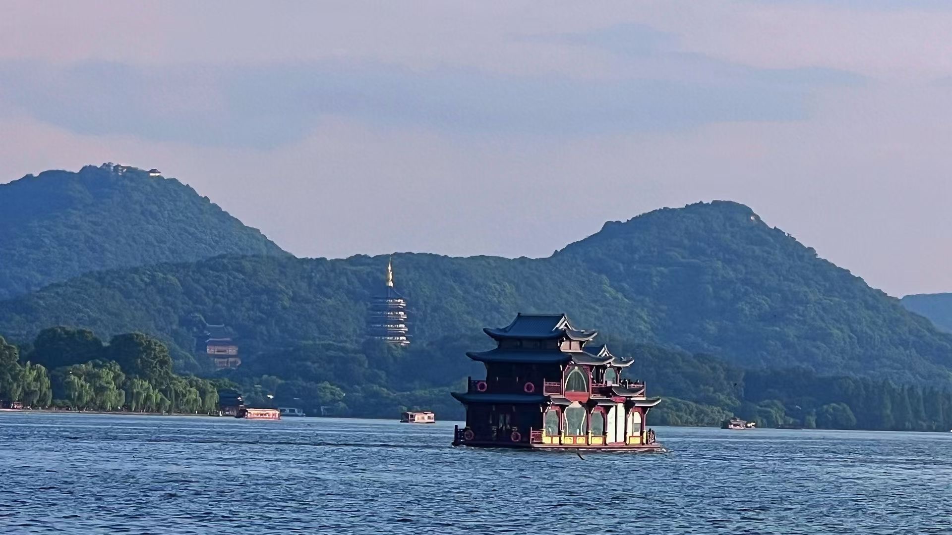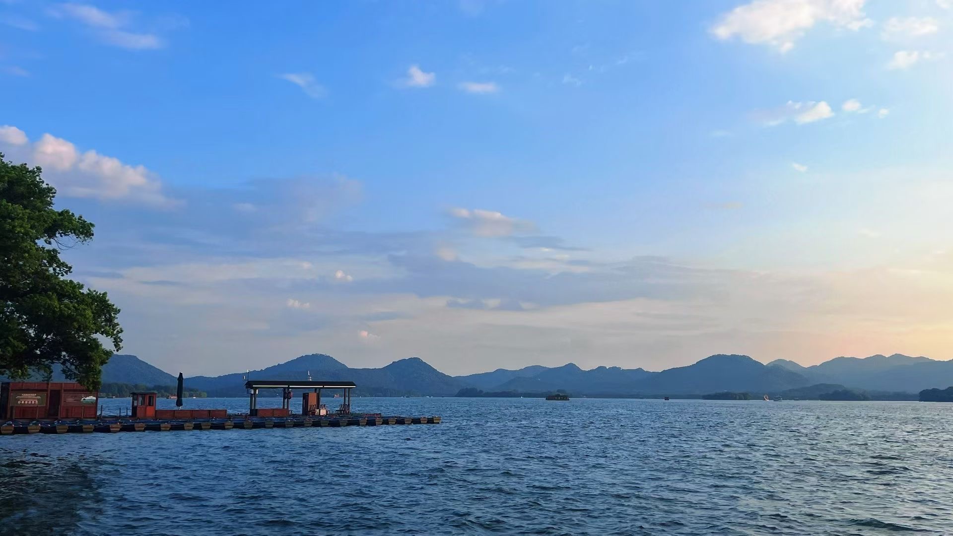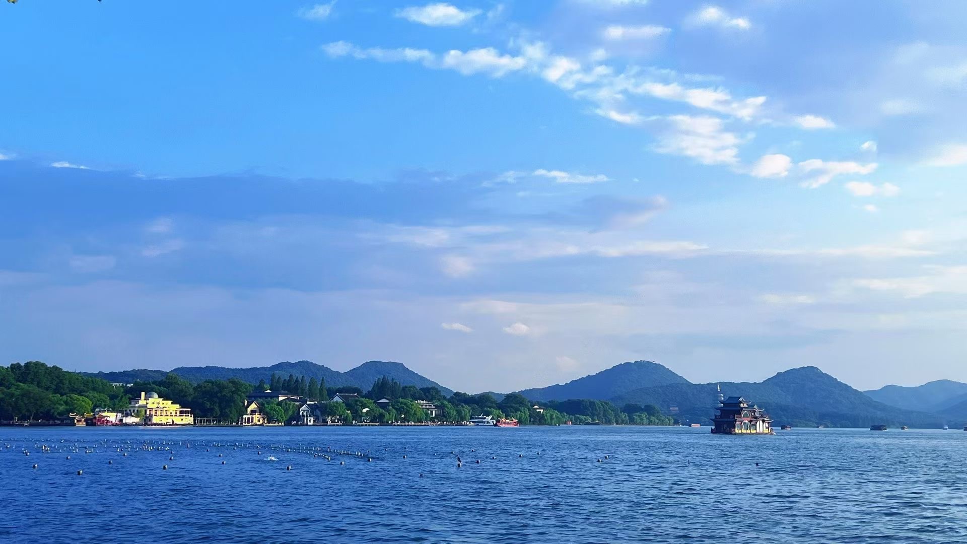 浅蓝天空飘着几缕云,岸边古树的影子浸在西湖湖水里,随着微波轻轻晃,把绿意揉碎成游动的翡翠。 (资料:紫阳街道富春街道 西湖 徐枫 摄)