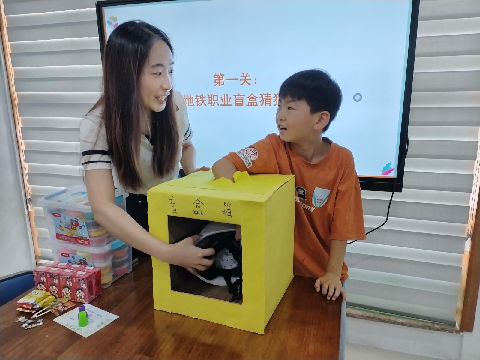 活动伊始,孩子们便被充满神秘感的“职业盲盒”环节深深吸引。大家纷纷上前,从小箱子中随机抽取代表不同职业的趣味道具。“安全帽”、“手电筒”、“售票盒”……一件件道具激发了孩子们强烈的好奇心与想象力。他们或凝神思考,或争相竞猜,更兴奋地模仿着道具所代表职业的经典动作和姿态,现场笑声与掌声此起彼伏,在轻松愉悦的氛围中悄然打开了对地铁相关职业认知的大门。