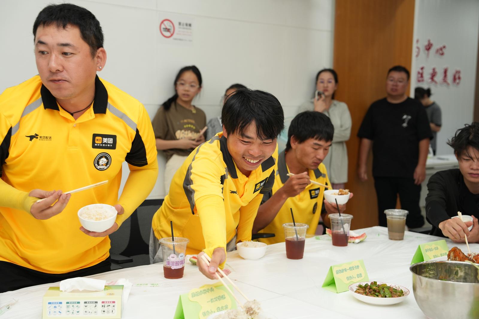 “嗯,这碗狮子头的味道非常地道,和我妈做的味道一模一样”。8月15日下午4点左右,丁兰街道大唐苑社区党群服务中心的活动室暖意融融、香气四溢,外卖骑手小王夹起一口狮子头品尝后便红了眼眶。当天,社区邀请25组亲子家庭,提前在家烹制家乡菜,带着家的味道齐聚社区,与骑手们共享美食。现场音响播放着舒缓的音乐,大屏幕上播放着亲子家庭制作菜品及孩子们对骑手的寄语的温馨片段,搭配社区提前准备好的冰镇绿豆汤、酸梅汤等,让高温天里的奔波者,收获满满的感动与清凉。