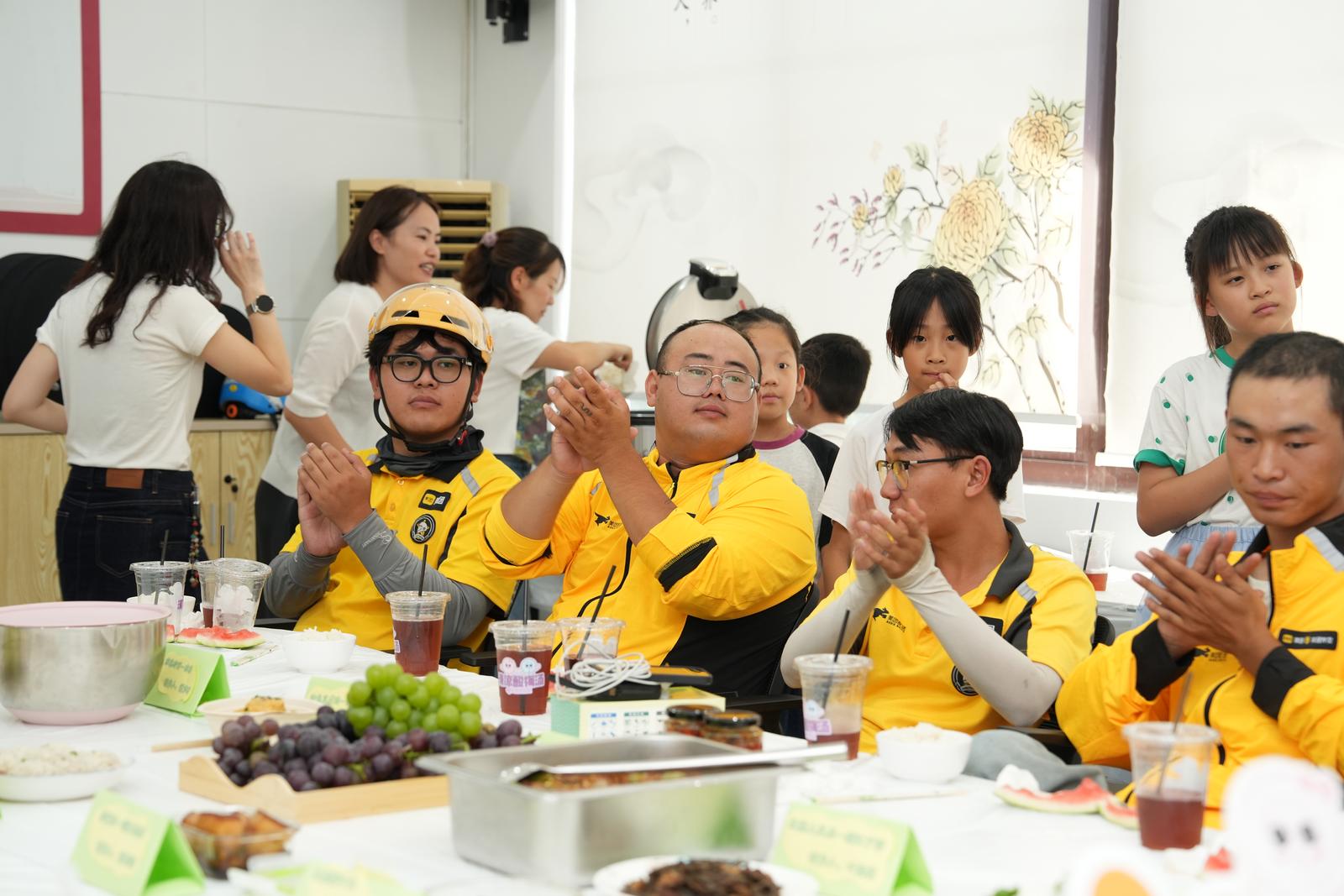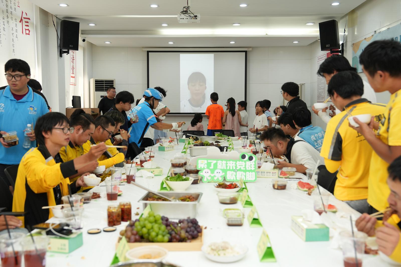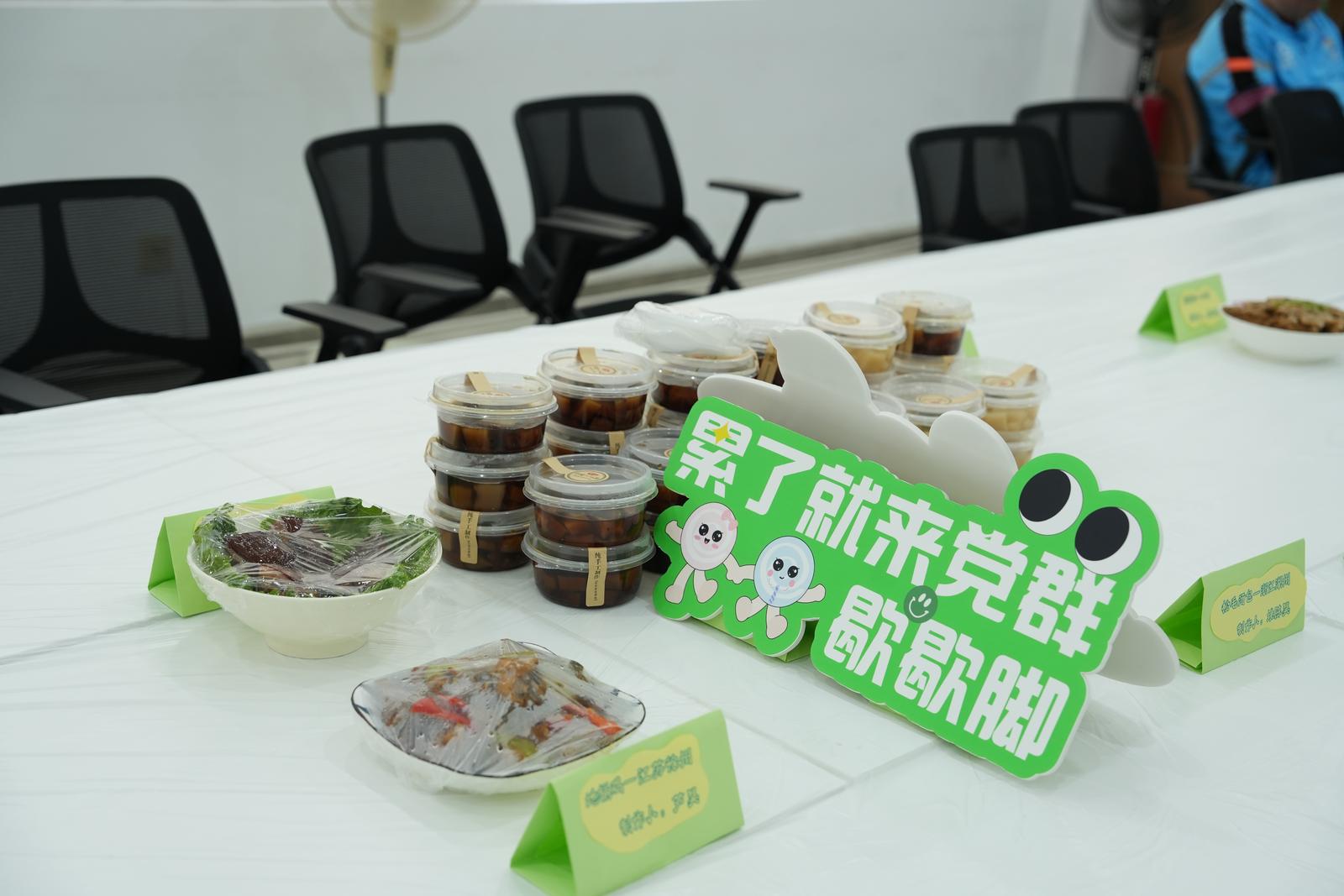 现场,亲子家庭和骑手们围在一起,共享美食。孩子们主动给骑手让菜,“叔叔,您尝尝我和妈妈做的松毛汤包”,“叔叔,我们是地锅鸡,尝尝我们的”……骑手们一一笑着回应,然后和孩子们聊起跑单时的趣事。社区工作人员则忙着给大家盛绿豆汤,“天热,喝点绿豆汤解解暑!”清甜的绿豆汤搭配温热的家乡菜,活动室里满是欢声笑语。这个夏日的傍晚,因为一道道热菜、一句句暖心的话语,成了城市里最温暖的风景。