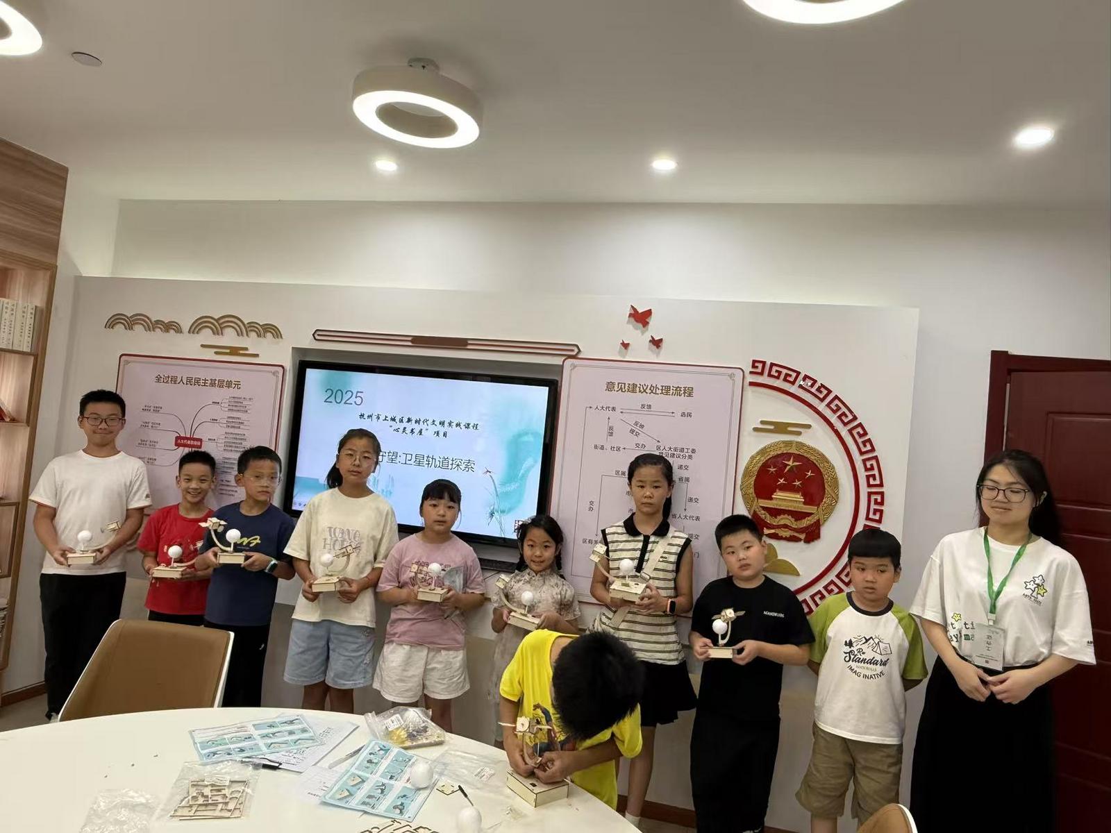 知识讲解后,孩子们在老师和志愿者的指导下,动手制作卫星轨道模型。他们利用泡沫球、铁丝、木板等材料,细心拼接、调整角度,努力还原地球同步轨道、极地轨道等不同形态。活动现场气氛热烈,孩子们互相协作,分享创意,一个个精巧的卫星模型逐渐成型。