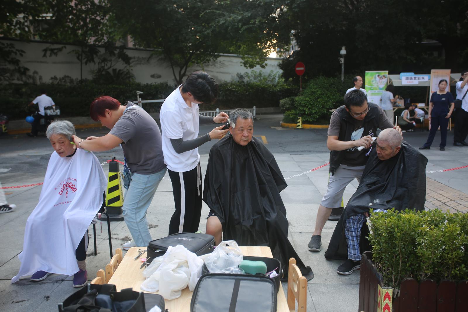 在便民服务区里,社区工作人员忙着提供政策解读、宣传反诈和科普知识,志愿者带来了免费理发,此外,社区还在便民服务区为居民们设置了凉茶和爆米花摊,免费向居民提供好吃的好喝的。
