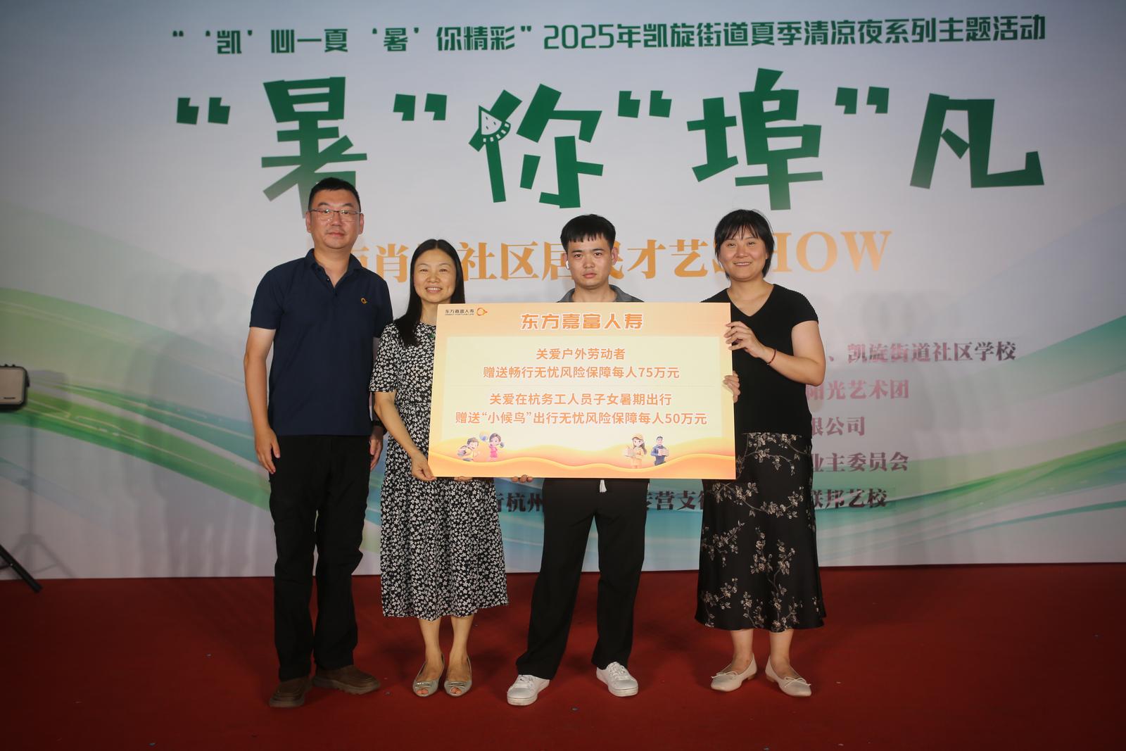 活动现场,公益市集早早排开8个摊位,成了活动最热闹的角落。爱心企业摊位上,乌梅健康饮、中医热敷体验、互动宋韵游戏——投壶、套圈等等摊位上人头攒动,市集上东方嘉富人寿还特设的“赠送保险”区,为户外劳动者和他们的“小候鸟”孩子们免费赠送畅行无忧意外险,并将其融入到“社区+保险”的民生实事项中目。