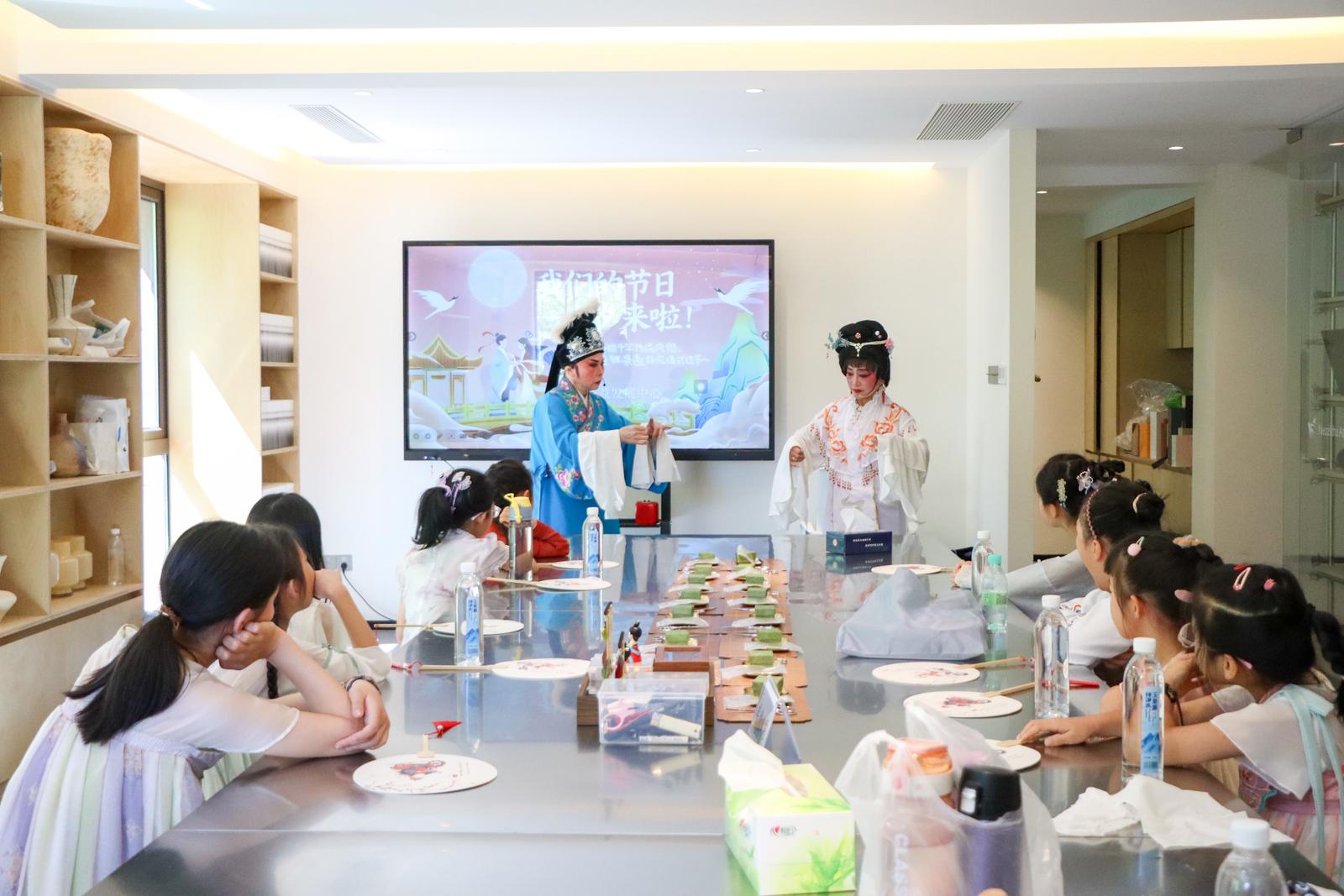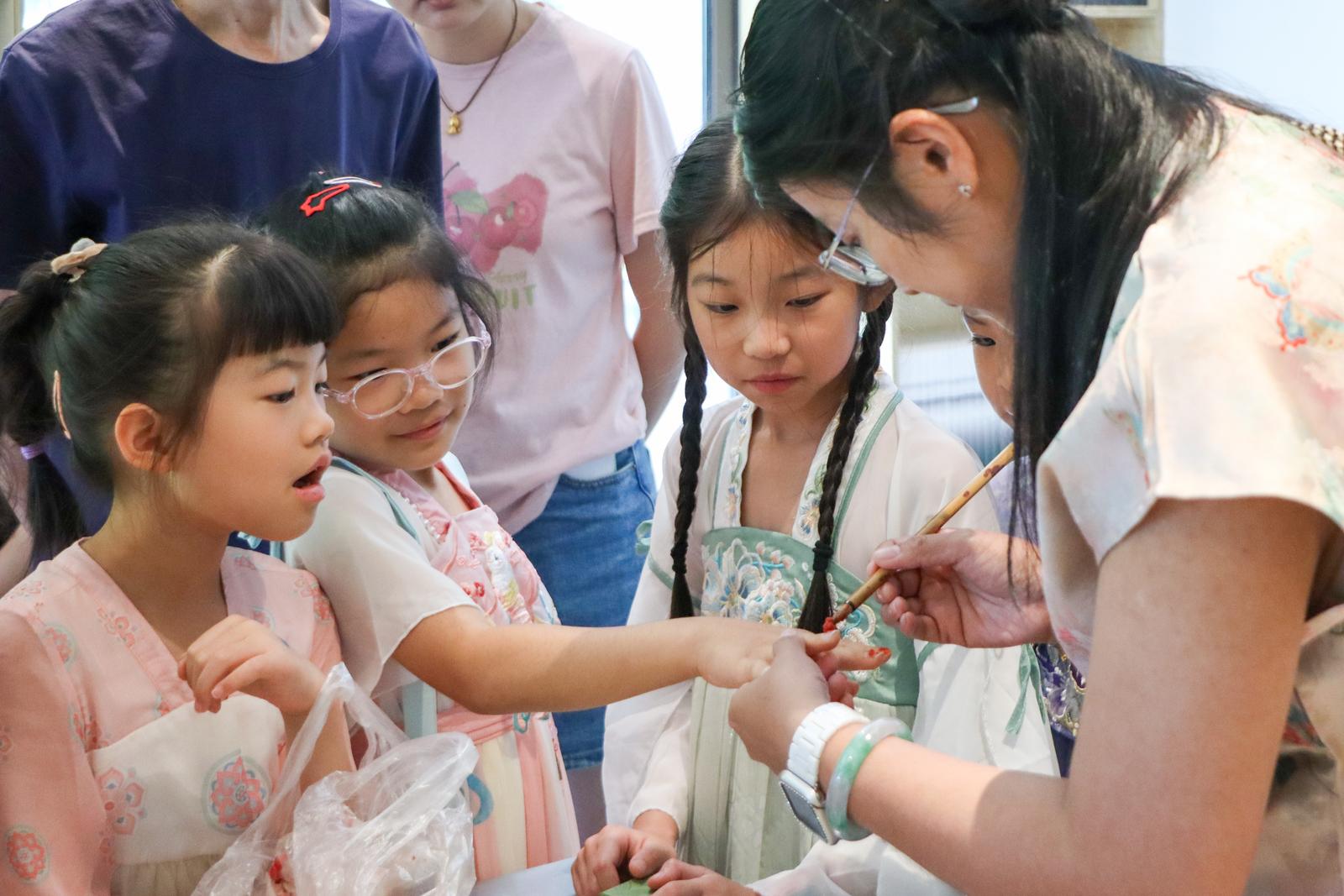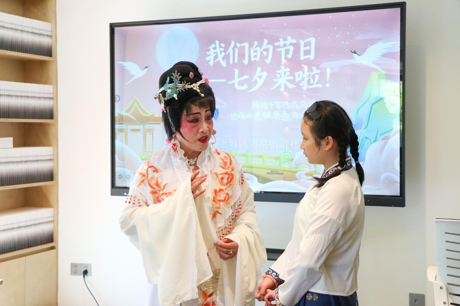 “凤仙染甲”环节最受女孩子欢迎。新鲜的凤仙花花瓣被捣碎成颜料,老师示范着如何涂在指甲上,孩子们围坐一圈,互相帮忙涂抹,“你的指甲像小桃花!”“我的比你的更亮!”叽叽喳喳的讨论声里,满是对“古人美甲”的好奇;“曲艺乞巧”则添了几分韵味,专业越剧老师先讲解七夕相关的选段背景,再逐句教唱,即使是零基础的孩子,也跟着旋律慢慢哼唱,稚嫩的歌声混着越剧的婉转,让现场多了传统节日的热闹。