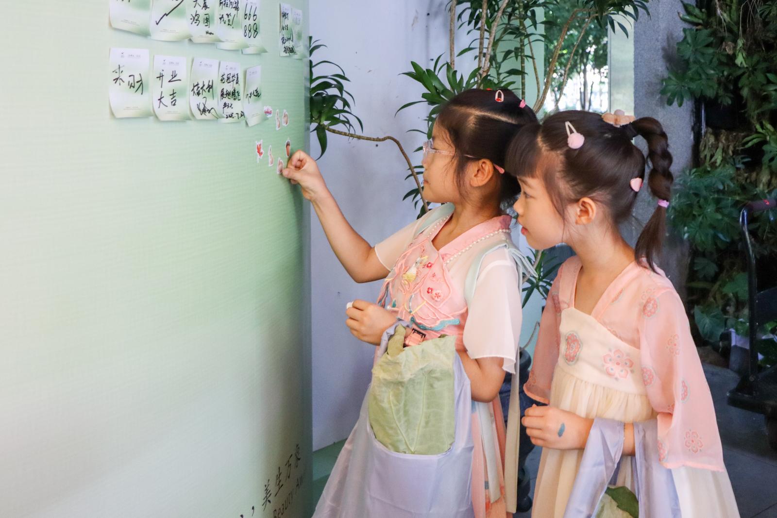 活动一开场,“国风签到”就把氛围感拉满。身着汉服的孩子们格外亮眼——有的梳着古典发髻,有的穿着浅紫、粉白的襦裙,手捧着工作人员准备的古风签到贴,认真写下自己的名字和七夕心愿。签到时,工作人员还为每个孩子送上了环保小礼品和宣传手册,既延续了古人“顺应自然”的理念,也让绿色生活的意识悄悄融入传统节日体验中。