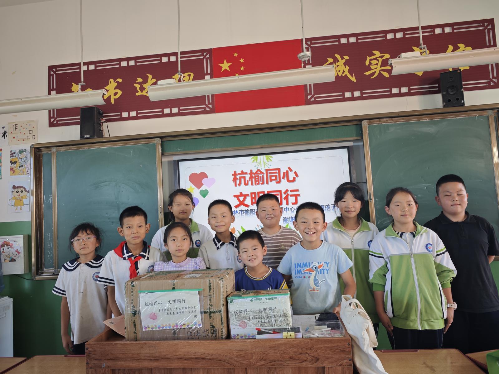 中午11时,2箱贴有“杭榆同心 文明同行”标识的书籍在“景秀嘉 益齐行”志愿者、青少年志愿服务协会志愿者护送下前往邮局,开启1700多公里的绿色重生之旅。5天后的9月1日,包裹在榆林市巴拉素镇中心小学教室内被拆开,孩子们同时收到了三份礼物:泛着油墨香的书籍,独一无二的绿书签以及江南少年们藏在字里行间的期待——“等你告诉我,陕北的星空和书里描写的一样璀璨吗?”教师代表刘老师在发来的信息中感动地表示:“这份特殊的开学礼物不仅丰富了新学期学校的图书资源,更让学生感受到千里之外的情谊。”