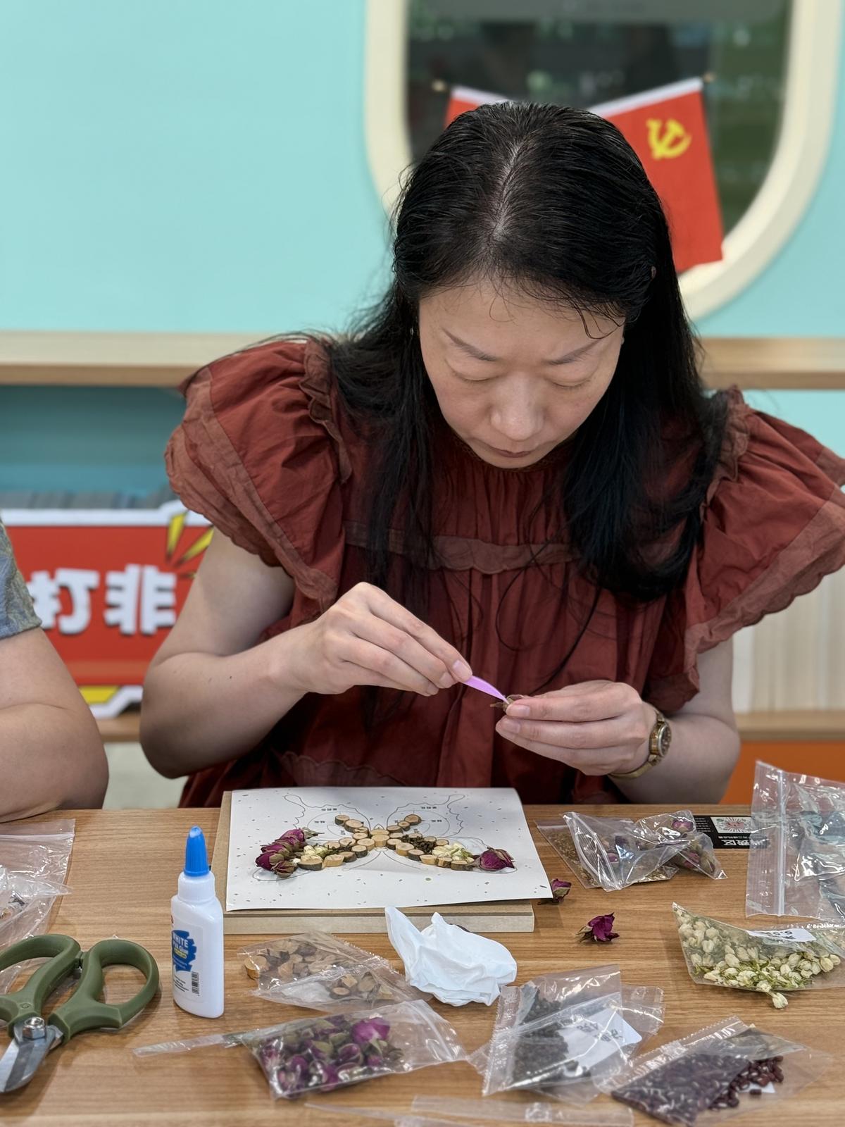 “白露养生重‘润燥’,咱们用的这些药材,既能入画,不少也是秋日养生的好帮手。”非遗传承老师一边展示提前备好的中药画样品,一边向楼宇职工讲解:“比如这桂花,不仅能贴出秋日的暖黄,泡茶还能理气解郁;紫苏叶剪碎了能做蝴蝶的剪影,煮水又能驱寒……”她拿起一片片桂枝,轻轻按在纸上:“像这样用天然叶片做‘拓印’,再用红豆勾几笔触角,一幅《蝴蝶图》就有雏形了。”