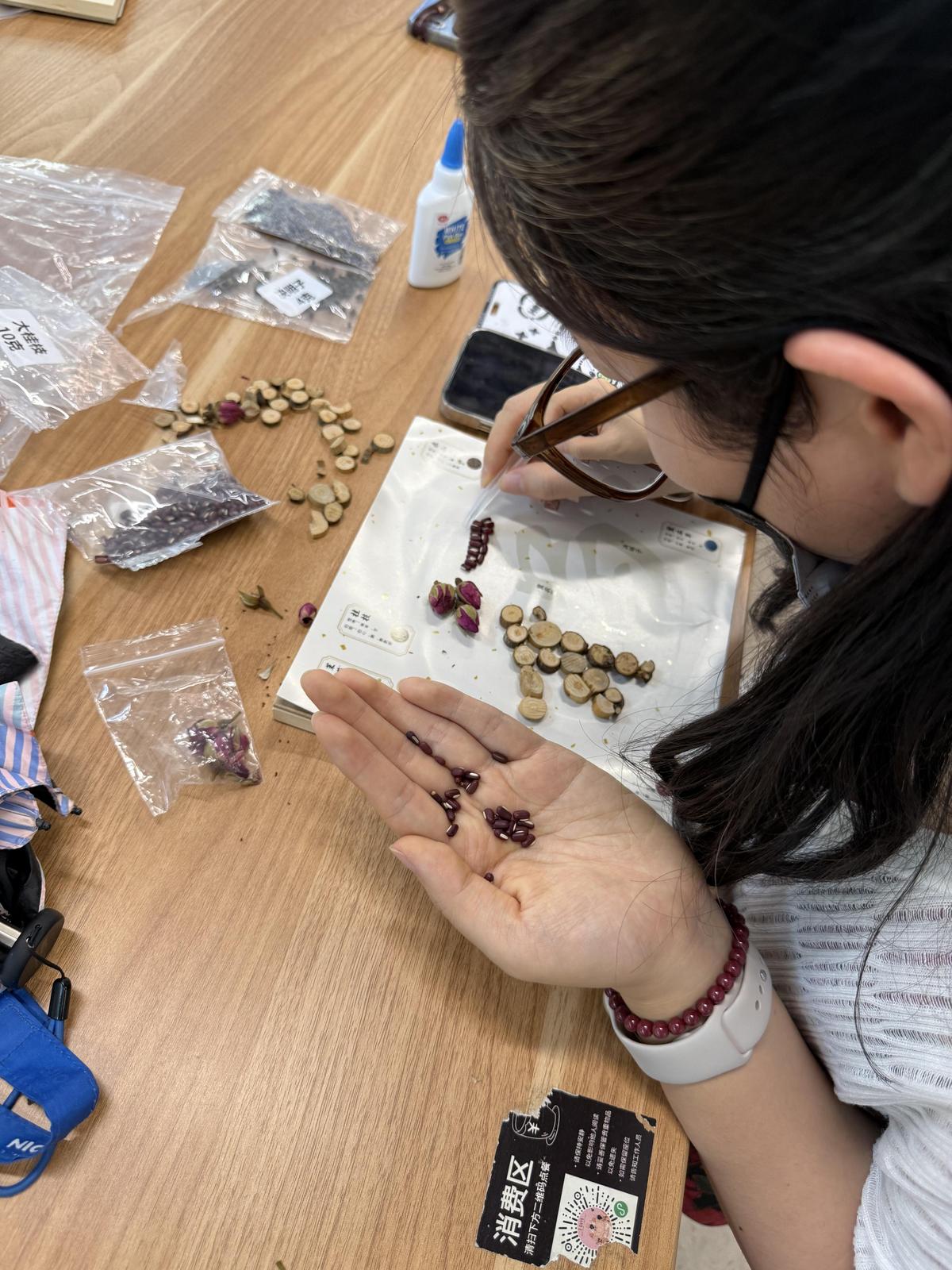活动现场,整齐摆放着薄荷、桂花、茯苓、紫苏叶等十余种常见中药材——翠绿的薄荷带着清冽香气,金黄的桂花缀着细碎甜意,晒干的陈皮呈深浅不一的暖褐,连碾碎的茯苓粉都透着细腻的米白,天然色彩与纹理成了最特别的“颜料”。