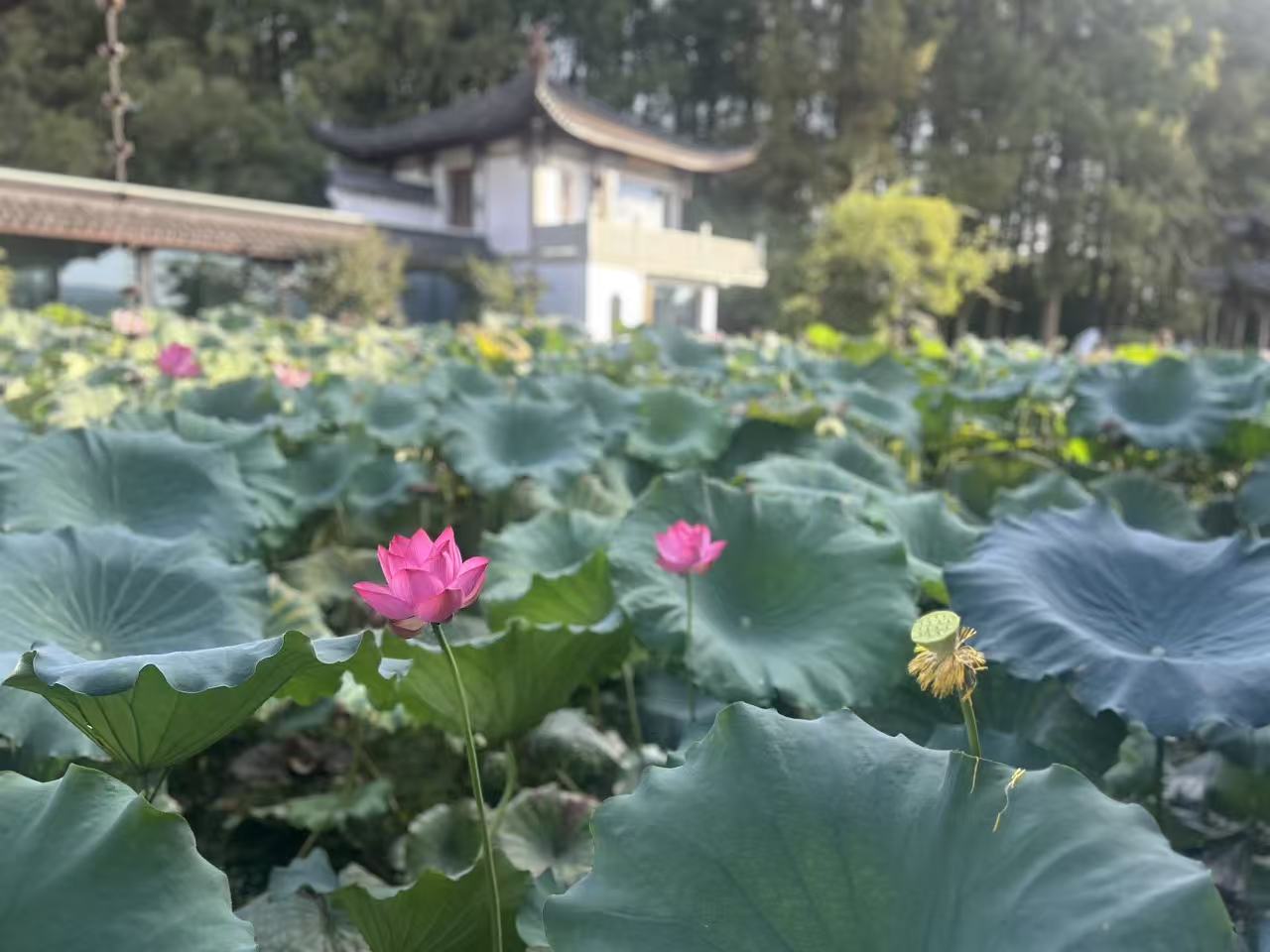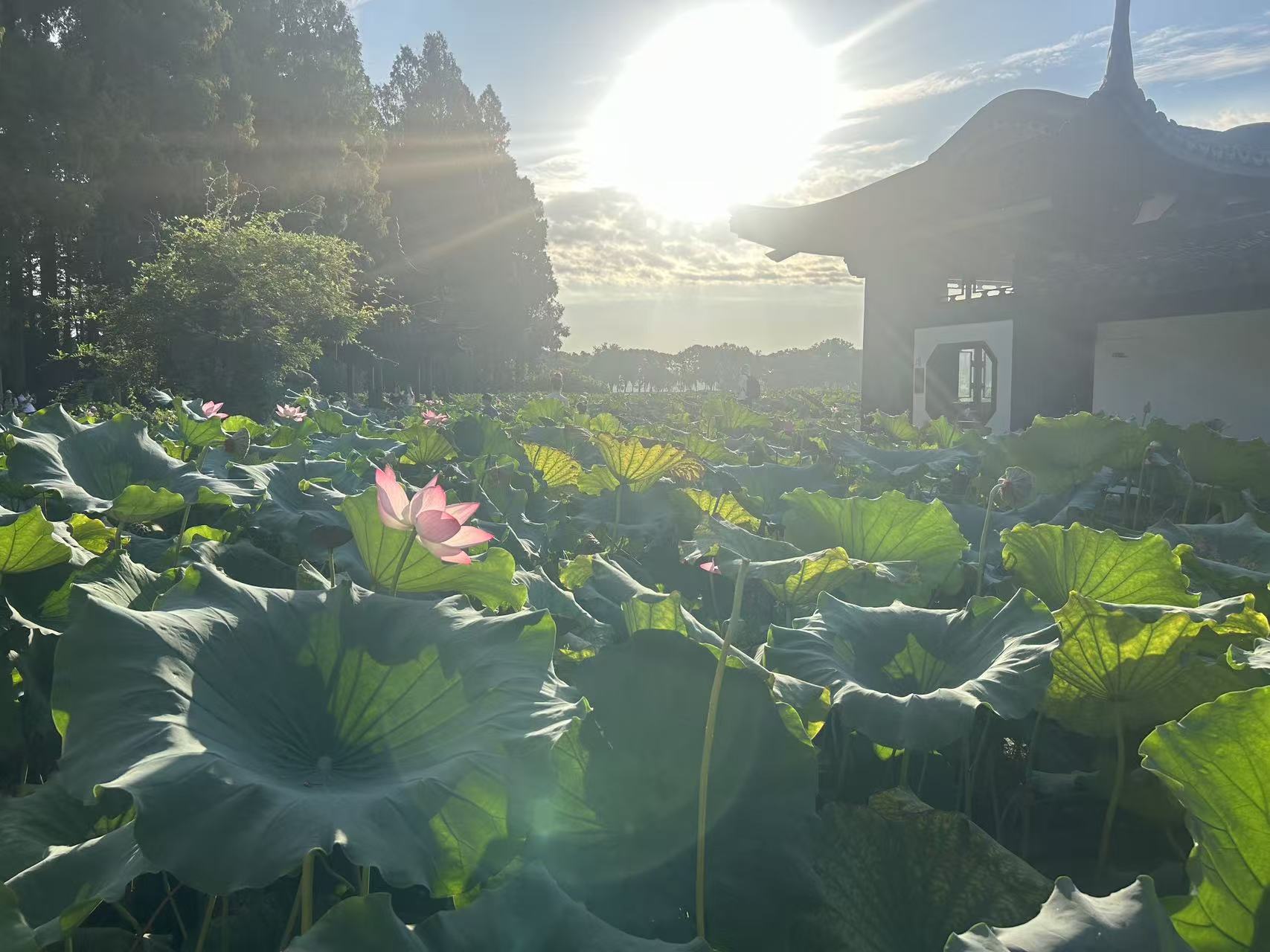【荷影绰约 湖光旖旎】 清晨,当第一缕曙光穿透薄雾,轻柔地洒向西湖,满湖的荷花,荷叶密密层层地铺展在水面上,宛如一块巨大的绿色绒毯。(2025年9月 西湖 王铁霞 摄)