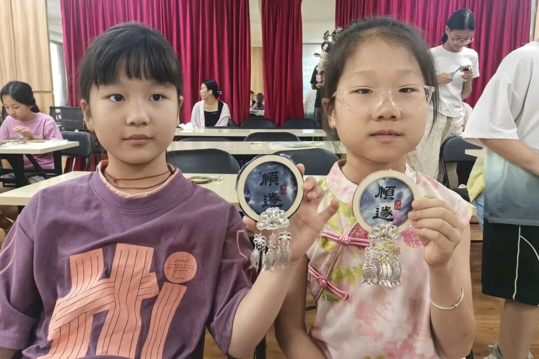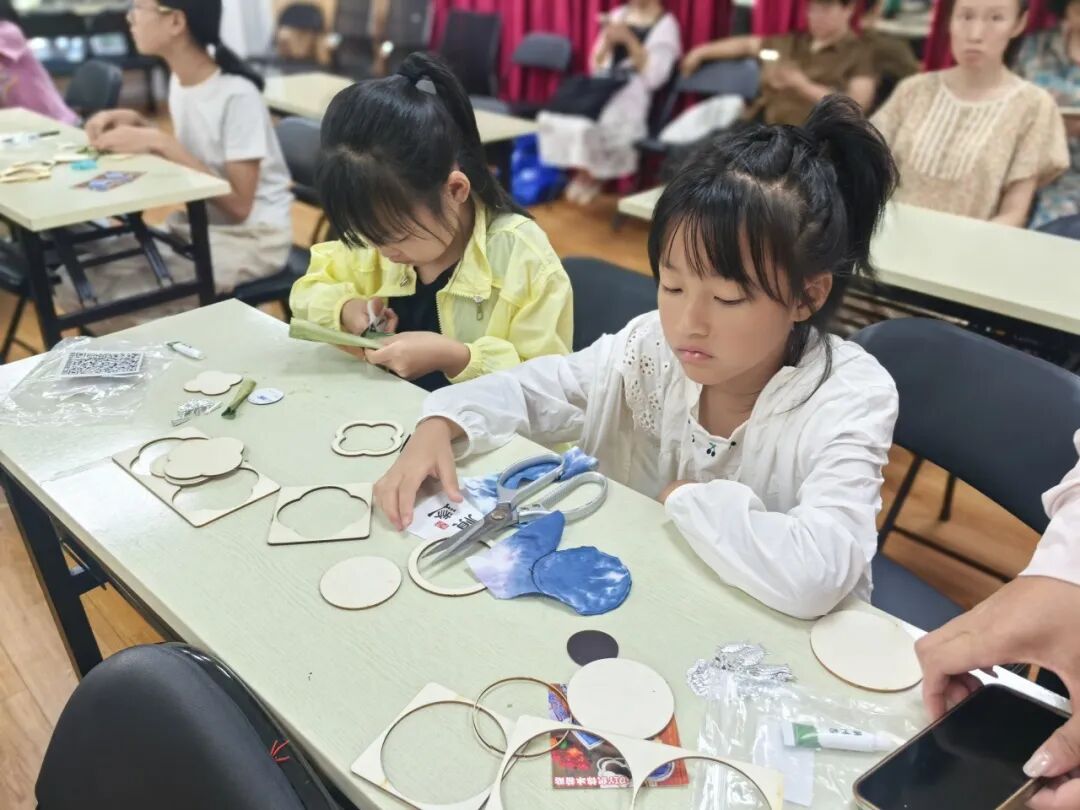 手工制作环节,沈老师为大家分发苗银基材、彩绳、磁铁等材料包,详细演示剪、弯、串、粘等制作步骤。孩子们化身“小小非遗传承人”,小心翼翼地弯折银片、搭配彩绳,遇到难题时互相帮忙、向志愿者请教。经过近一小时的创作,一个个造型别致的苗银冰箱贴新鲜“出炉”,有的缀着灵动的银铃,有的刻着简约的图腾,充满童真与创意。