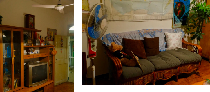 推开102室的门,仿佛时光倒流。暗红色木地板泛着岁月光泽,门头悬挂着玻璃珠帘,墙上贴着旧画报,老式电风扇一看就转起来会“嗡嗡”响,还有一台保留原样的缝纫机……一切仿佛定格在上世纪八十年代。