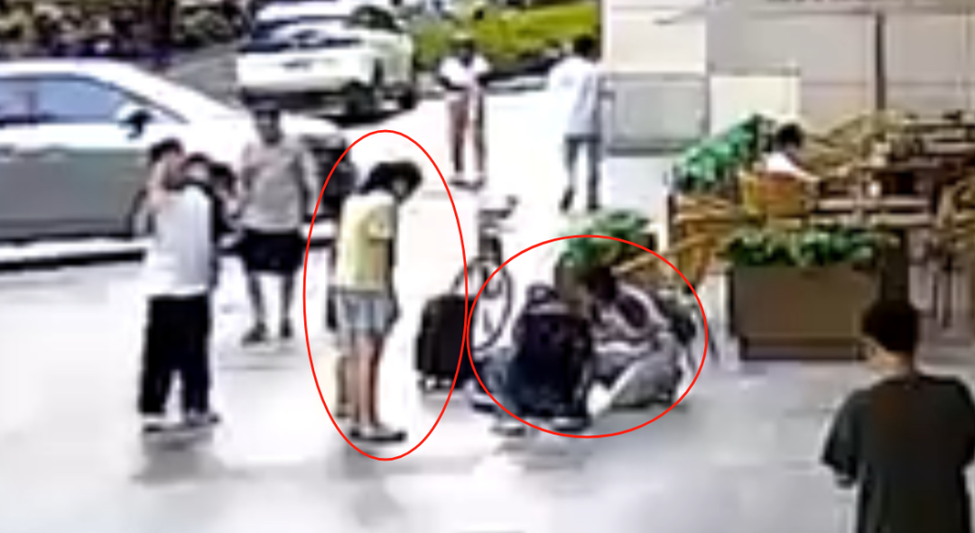 两名刚从商场走出的女士注意到,驻足回头。正巧一名骑着小红车的男子扭头一看,车子丝滑地骑出数米,便直接折返。而不远处刚刚路过的另两名年轻人也停住,回了头......