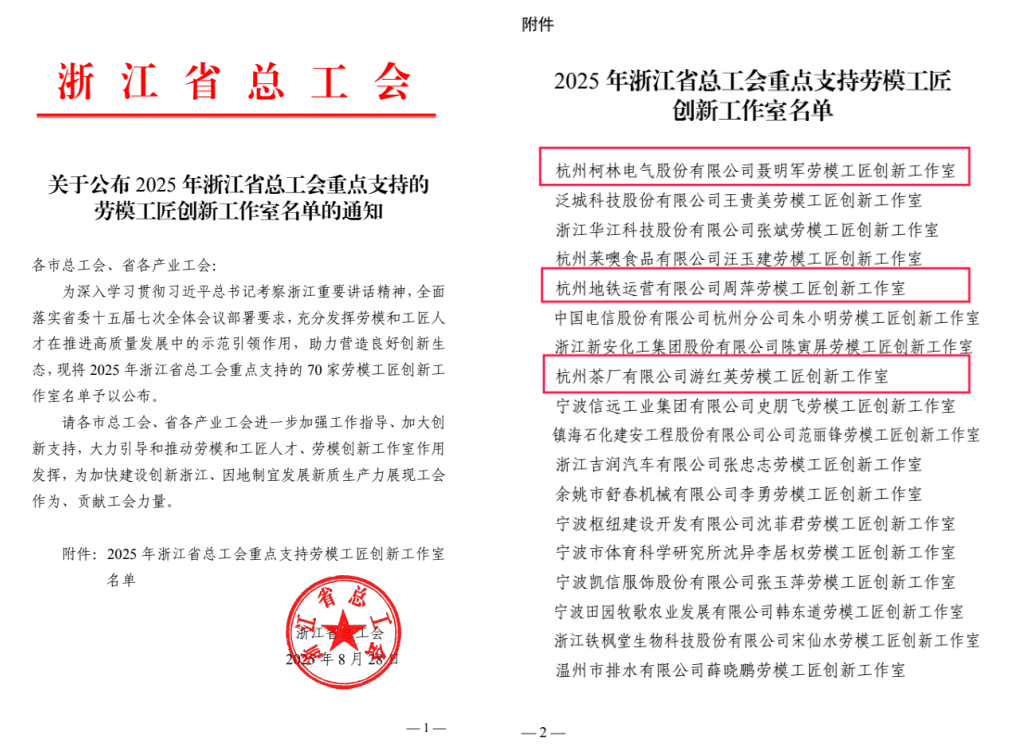 日前,浙江省总工会公布2025年重点支持的劳模工匠创新工作室名单,其中上城3家入选,分别是:杭州柯林电气股份有限公司聂明军劳模工匠创新工作室、杭州地铁运营有限公司周萍劳模工匠创新室、杭州茶厂有限公司游红英劳模工匠创新工作室。