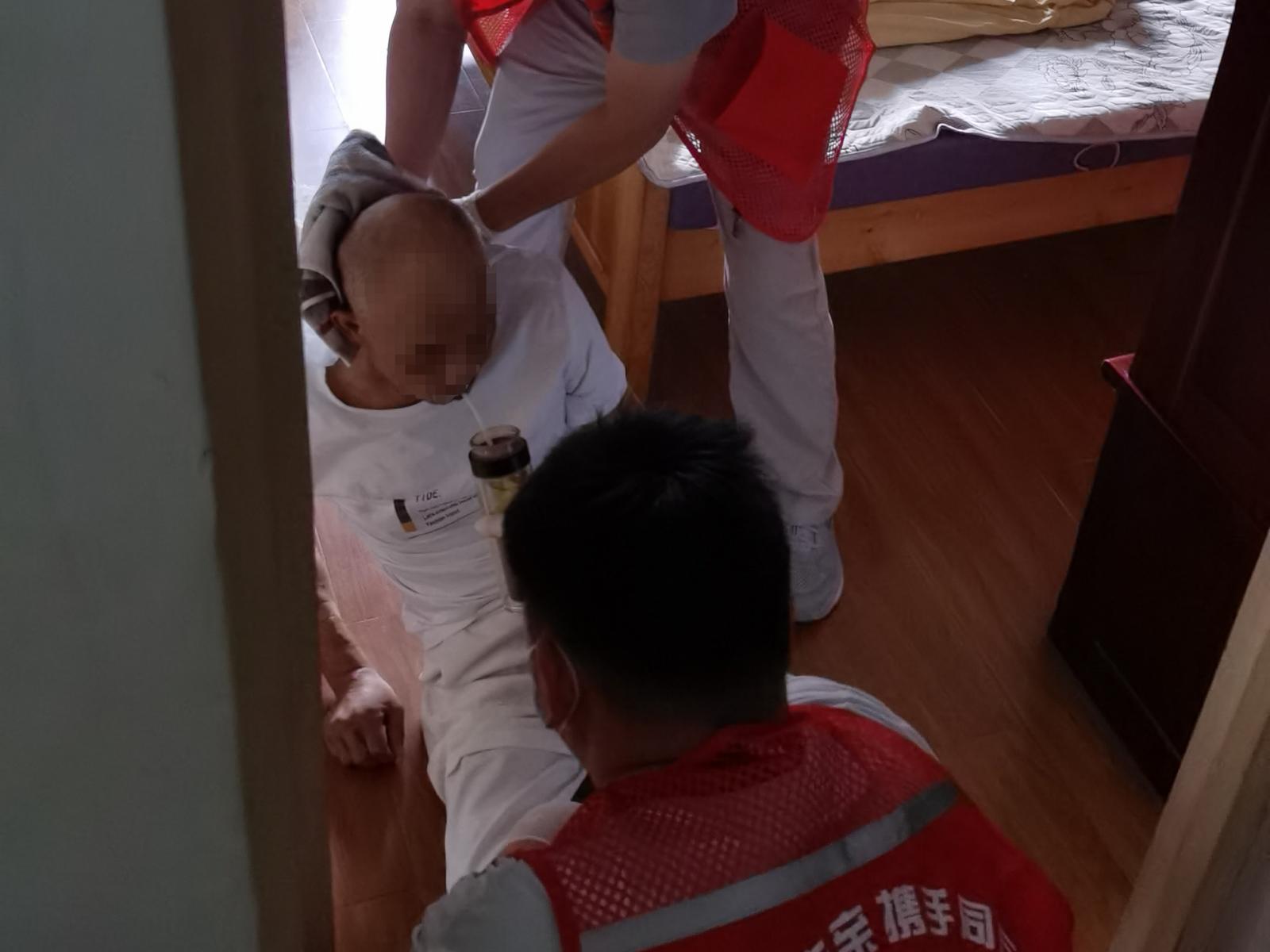 分工救援随即展开:马晨立刻拨通120,清晰地报出地址、说明老人头部外伤情况,还特意强调其脑梗病史,为急救提前提供关键信息;吴杰则从应急包里翻出干净毛巾,半蹲在老人身边,用适中力度按压伤口止血,同时轻声念叨着“贺师傅别慌,救护车马上到”,一点点缓解老人的紧张与疼痛。考虑到老人可能因摔倒出现脱水不适,马晨又倒来温水,小心翼翼地协助老人少量饮用。