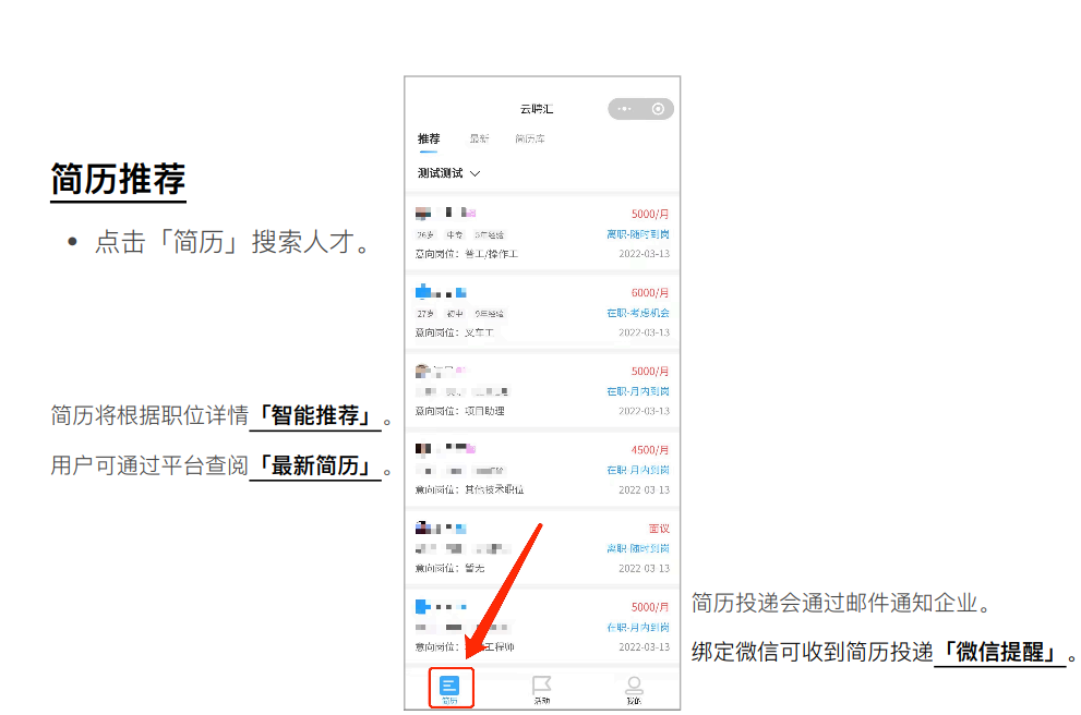 ▲简历将根据职位详情「智能推荐」。用户可通过平台查阅「最新简历」。简历投递会通过邮件通知企业。绑定微信可收到简历投递「微信提醒」。