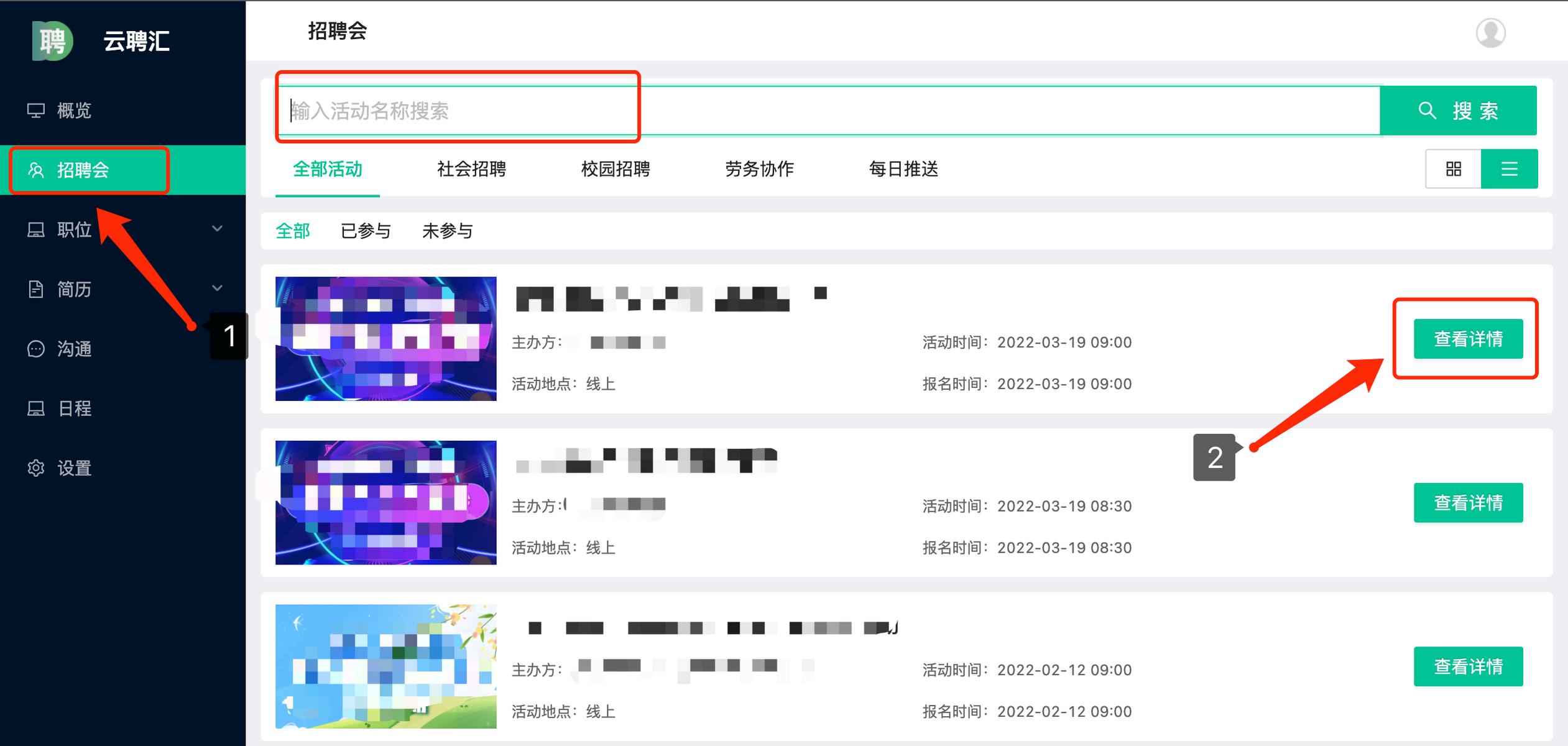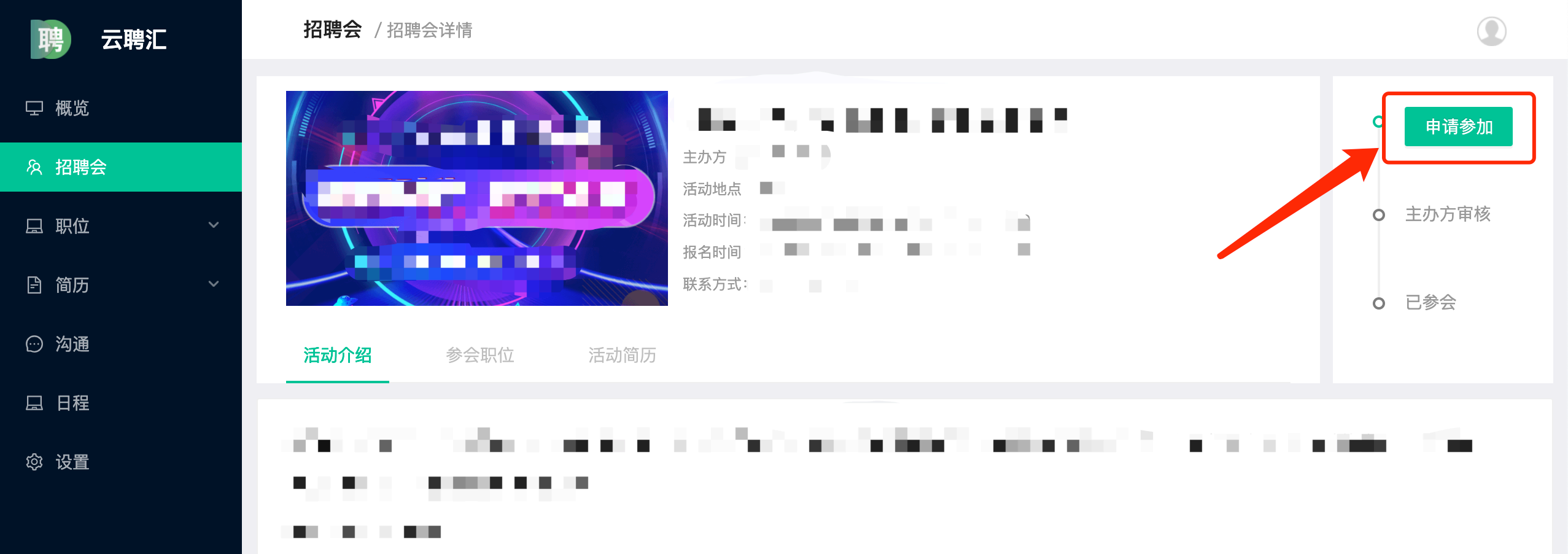 左侧点击“招聘会”选择活动完成参会报名,等待主办方审核。
