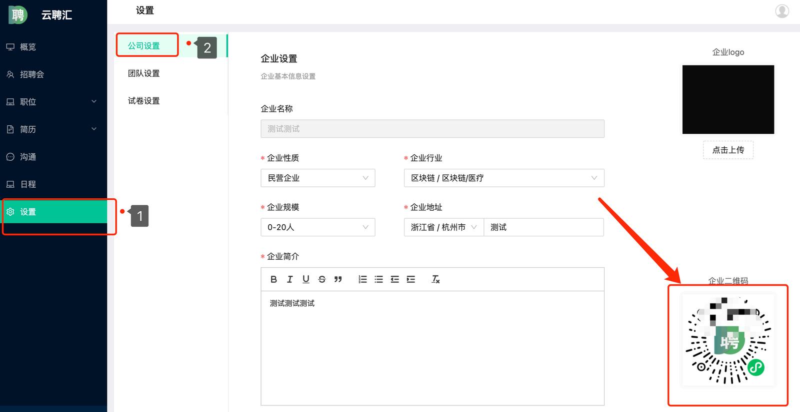 左侧点击「设置」—「公司设置」获取企业专属名片二维码。可分享至朋友圈或聊天中,名片二维码永不过期。