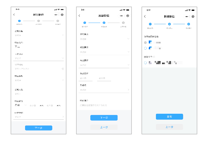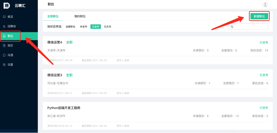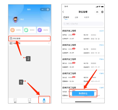 ▲职位管理•底部点击「我的」→「职位管理」对职位进行管理。点击「新建职位」根据企业招聘需求选择平台发布。