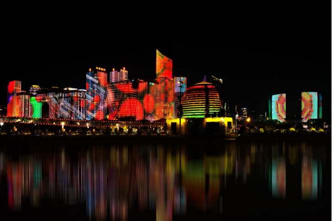 灯光秀以影视镜头语言为视觉串线,串联“秋辉雅韵”“秋色风华”“潮涌金秋”三大篇章,让全景铺展、中远景漫游、特写聚焦交错叠加,形成“静美——抒情——激昂”的秋曲节奏,解构杭城秋天“雅致如宋画,澎湃似江潮”的双重魅力。