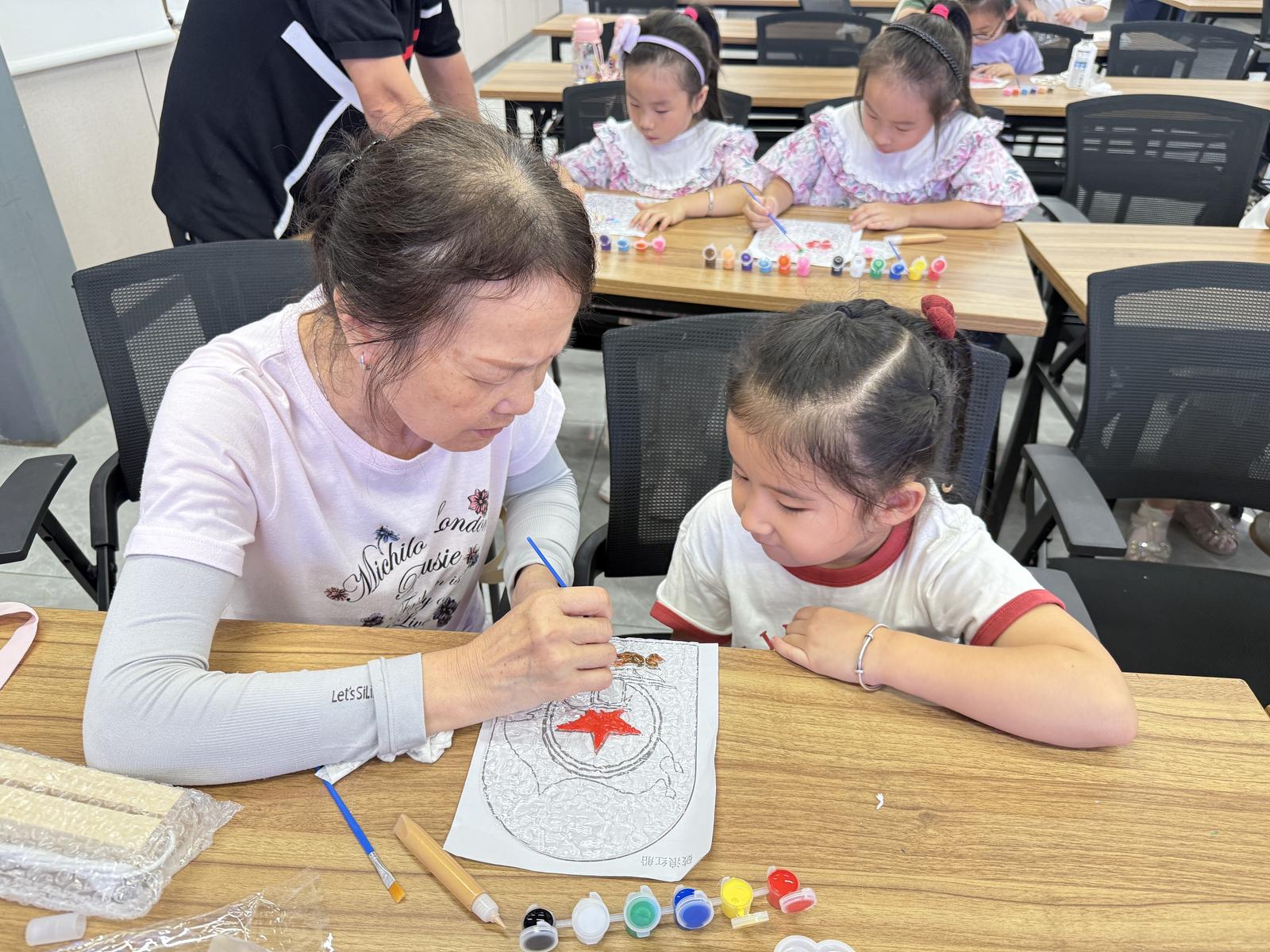 活动伊始,社区活动室已被温馨氛围包裹:桌上整齐摆放着透明灯座、丙烯颜料、细头画笔等材料。杭州银行志愿者首先登场,结合图片与视频讲解玻璃画的历史渊源,从传统工艺传承讲到红色符号的时代内涵,“五角星象征着革命信仰,天安门是祖国的象征,这些图案藏着先辈们的奋斗故事”,生动的讲解让孩子们对创作充满期待。