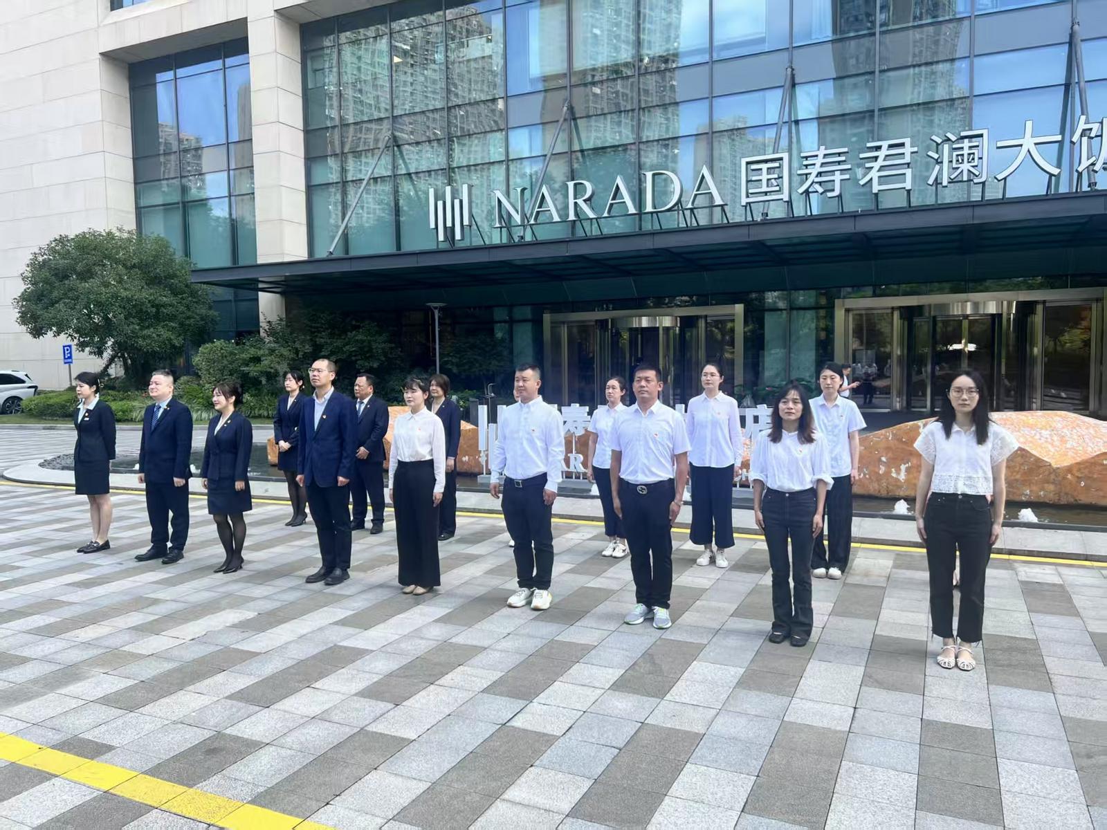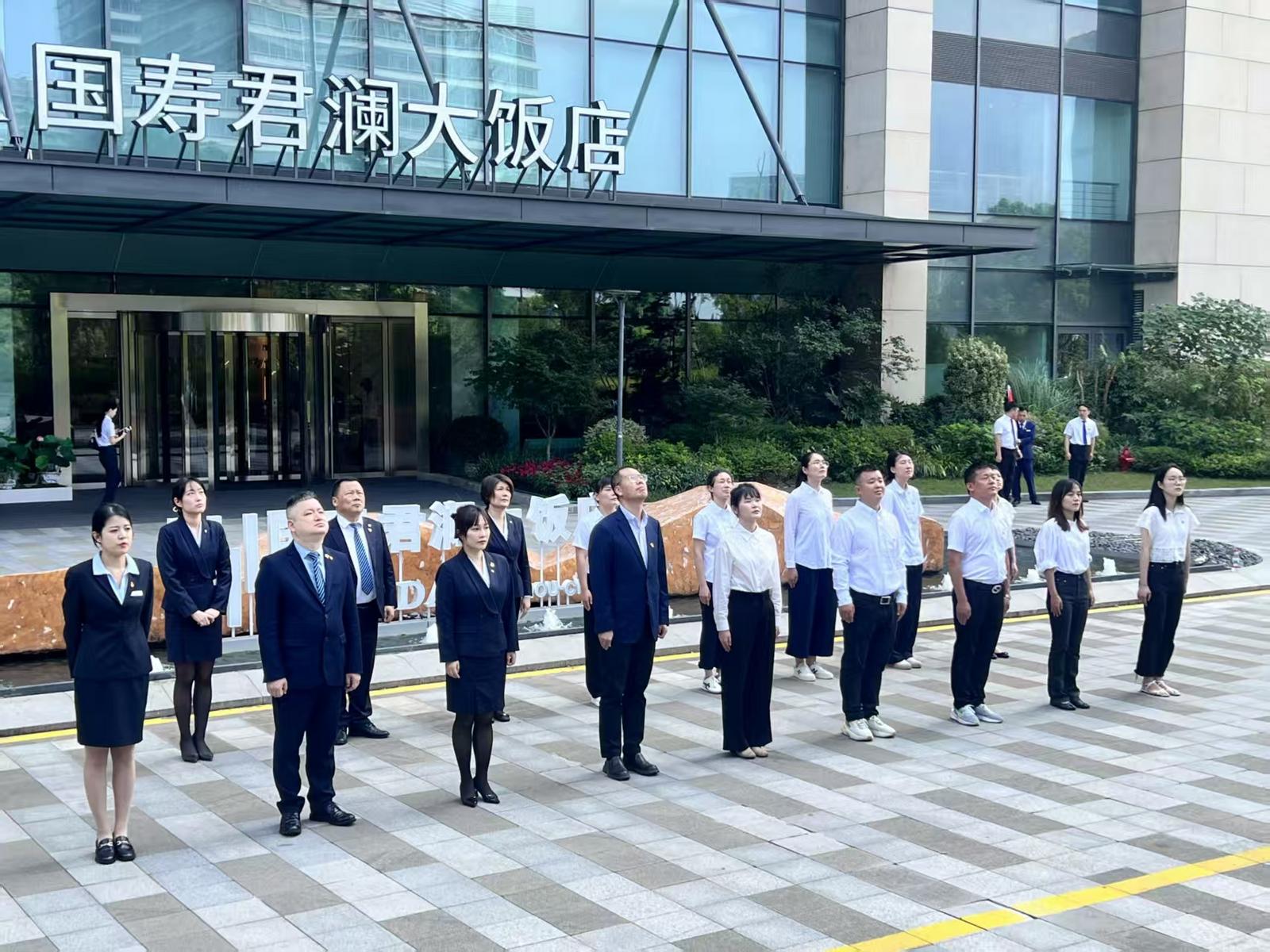 清晨微风徐徐,秋阳初升,国寿君澜酒店广场布置庄重而简洁。青年党员们统一身着白色衬衫和深色长裤,党员徽章在胸前熠熠生辉,整齐列队静待仪式开始。九时整,升旗仪式正式启动。三名由共建单位优秀青年党员组成的护旗手迈着坚定有力的正步,护卫五星红旗步入广场。全体人员肃立注目,在激昂雄壮的《义勇军进行曲》中,鲜艳的五星红旗冉冉升起,迎风飘扬。青年党员们神情庄重,高唱国歌,用铿锵有力的歌声表达对祖国母亲的崇高敬意和深切祝福。