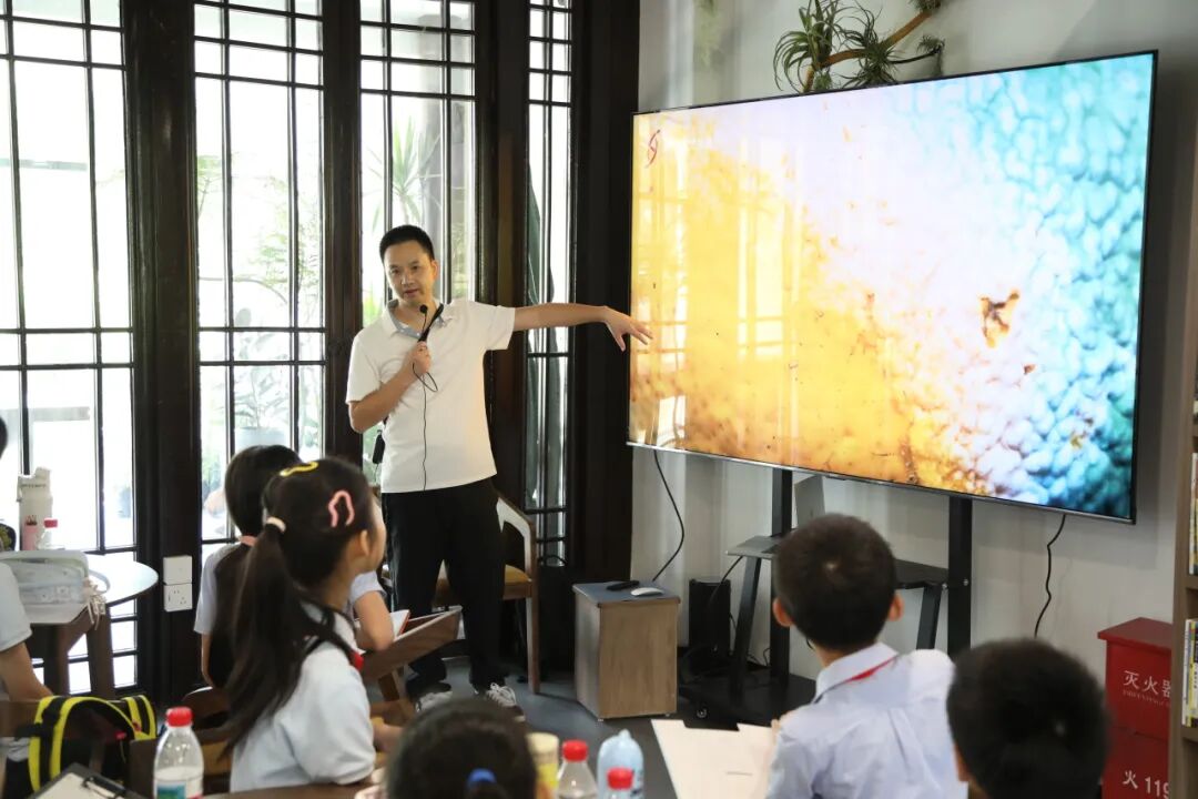 讲座过程中,周老师为学生们播放了一段由视觉部落原创制作的纪录片《菌物王国•最熟悉的陌生“人”》,该片以极为细腻的镜头语言,真实记录了皋亭山区域内丰富多样的菌类生长与生态过程。菌褶的纹理、孢子的释放、菌丝网络的蔓延等微观奇迹一一呈现,仿佛揭开了一个隐藏在脚下却从未被留意的王国。
