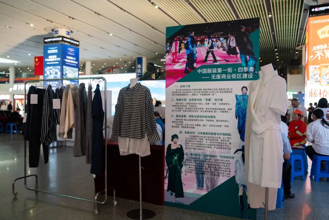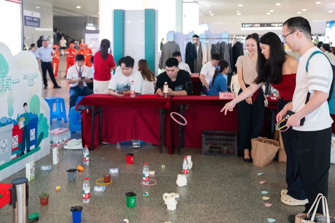 创意展示区内,再生面料服装展位人头攒动。来自浙江理工大学的“站小青”志愿者正向来往旅客介绍由废旧塑料瓶、渔网转化制作而成的时尚华服与文具,区综合行政执法局东站中队联合星巴克咖啡通过互动游戏的方式向旅客科普垃圾分类知识,联合国地球卫士奖“蓝色循环”项目的海洋塑料制品更成为焦点。据悉,本次活动有来自中国美术学院、浙江工业大学、浙江理工大学、杭州电子科技大学、浙江工商大学、浙江财经大学、浙江科技大学、杭州师范大学等8所高校共二十余名“站小青”志愿者,在活动现场的各个展区发挥青春志愿力量,成为无废理念的“青年翻译官”。