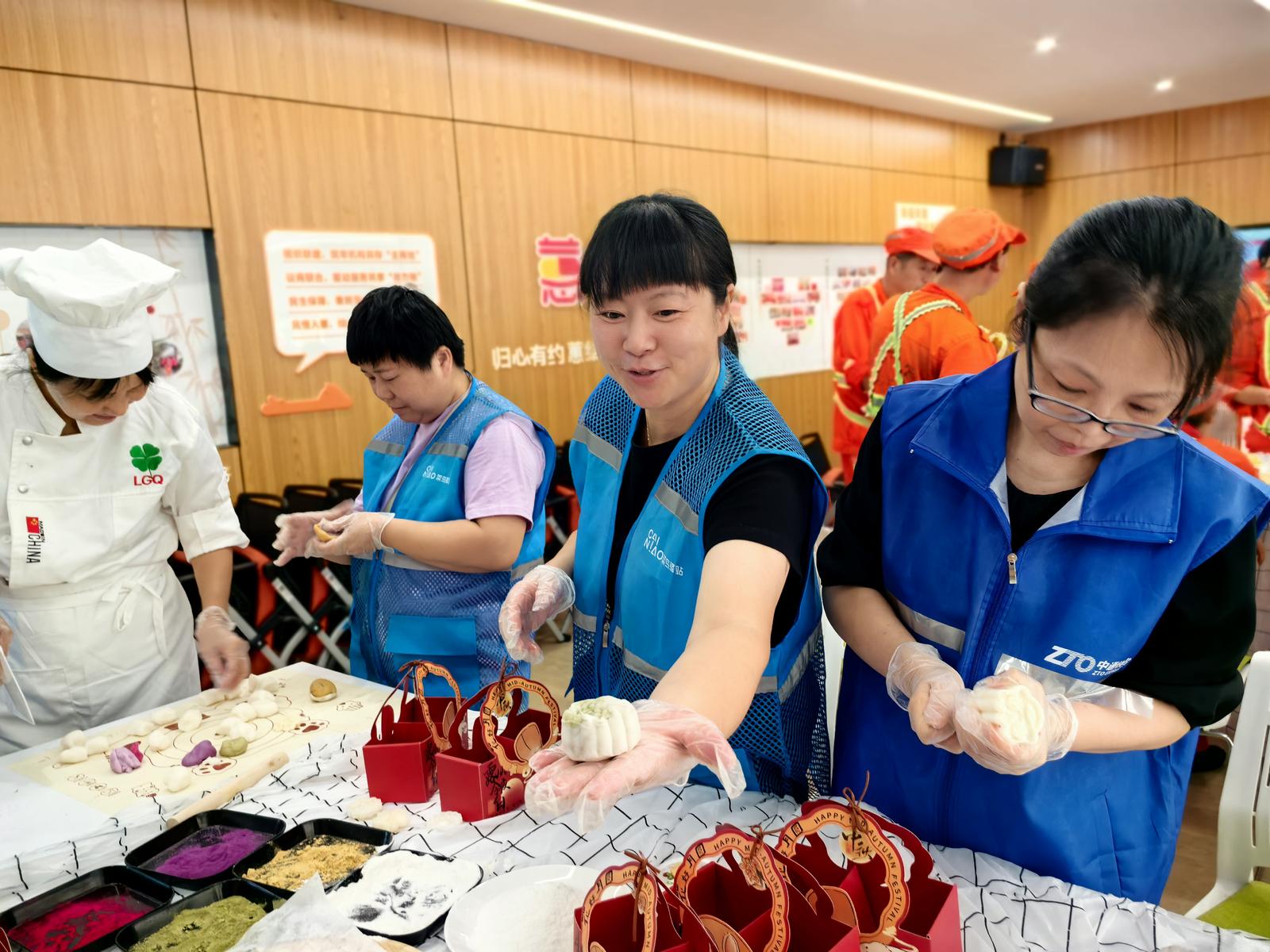 高级西点烘焙老师现场演示着揉面、包馅、压模技巧,工会志愿者全程协助。环卫工人鲍姐揉好首个面团后笑着说:“做了5年的环卫工人,头回在爱心驿家亲手做月饼,原来做冰皮月饼这么简单,不用烤制,做完就能品尝,比扫地简单多啦!”快递驿站谢姐巧用草莓粉将冰皮染成粉色,再用模具印压完成一朵粉嫩的“樱花”,仔细装进礼盒,拍照发给家人,她笑着说“让家里的孩子看看我的手艺,回家给他们尝尝这份特别的中秋礼”。