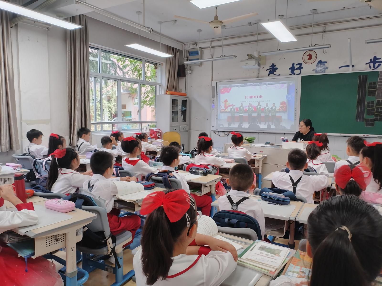 活动伊始,退役军人代表身着整洁服装走上舞台,以一首《打靶归来》拉开大赛序幕。“日落西山红霞飞,战士打靶把营归”,熟悉的旋律中,他们嘹亮的歌声瞬间点燃全场。台下学生们被军人的飒爽风采感染,纷纷跟着哼唱,稚嫩的嗓音与铿锵的军嗓交织,形成动人的合唱声浪。随后,在红歌比拼环节,以 “校外辅导员 + 退役军人” 双重身份参与评委团的冯志高老师一个 “暖心细节” 格外动人。当一年级小朋友因紧张忘词时,坐下台下的评委冯老师悄悄的用口型跟着哼唱提示,用眼神传递力量,让孩子们逐渐放松,越唱越有底气。与此同时,未轮到参赛的各年级学生,在班级内通过直播实时观看比赛,有的隔空鼓掌应援,有的跟着屏幕轻声哼唱,让红色氛围遍布校园每个角落。