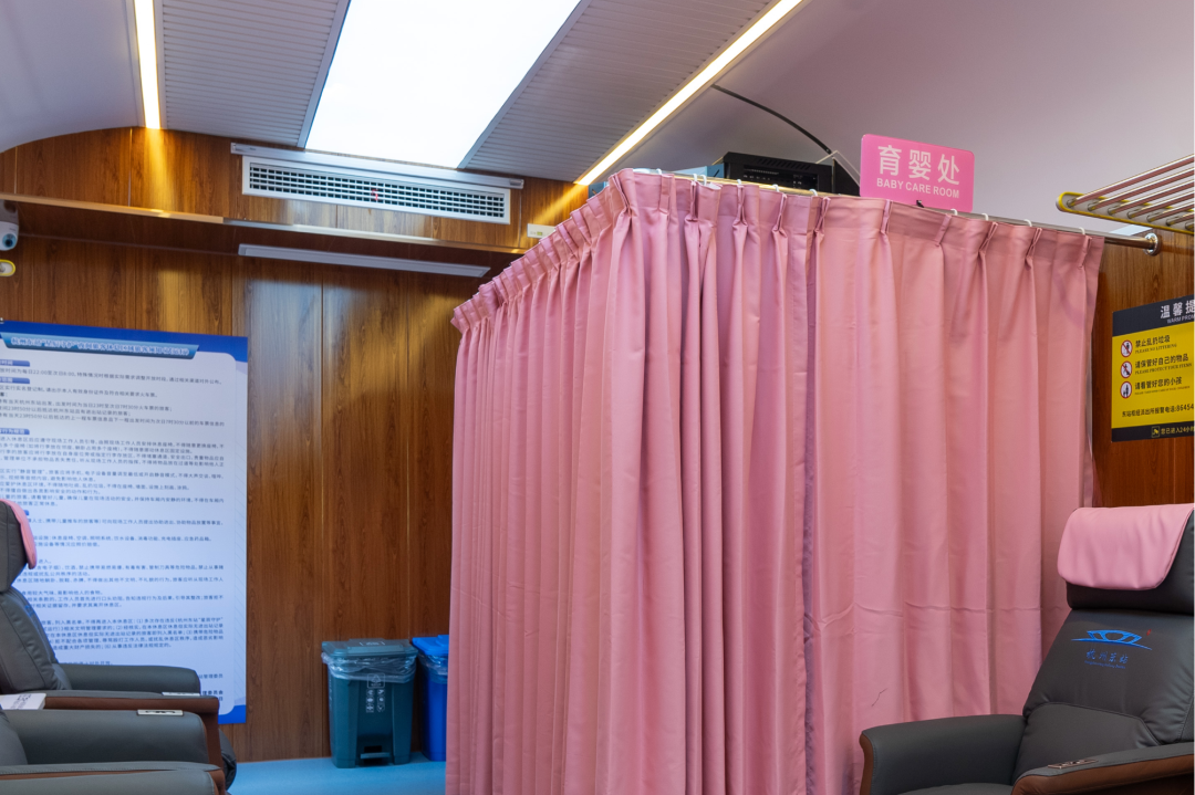 经过每节车厢,都能看到一个带帘的育婴区,这是专为带娃家长准备的应急空间。舒适的座椅、便捷的护理设施一应俱全,拉上帘子便是宝爸宝妈们的私密照料空间。