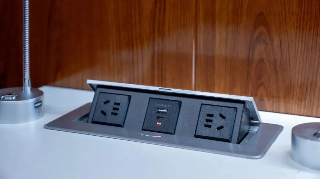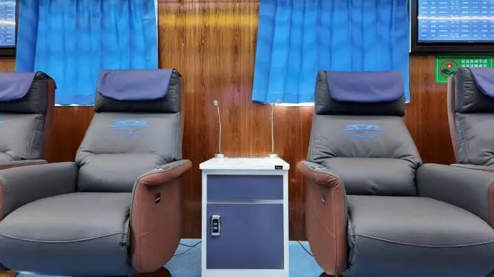 电动沙发旁的多功能边柜藏了许多小“巧思”:顶部嵌入柔光小夜灯,夜晚能提供温和而充足的照明;柜体上方的充电接口,可供旅客随时为手机、平板等设备充电;下方储物柜配备独立电子锁,旅客凭专用柜卡即可安全存放行李、背包等私人物品。