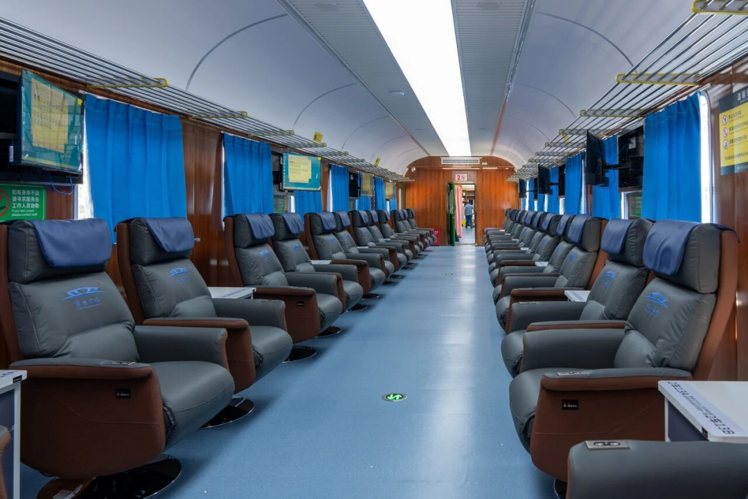 这可不仅是一处拍照打卡的复古背景,其内部核心设施是126组多功能一体化电动沙发,可以多角度调节,满足旅客坐、靠、半躺等不同休憩需求。车厢的宽度有3.7米,比正常YZ22型绿皮火车的车厢更宽,因此不用担心放下座椅会影响到他人。