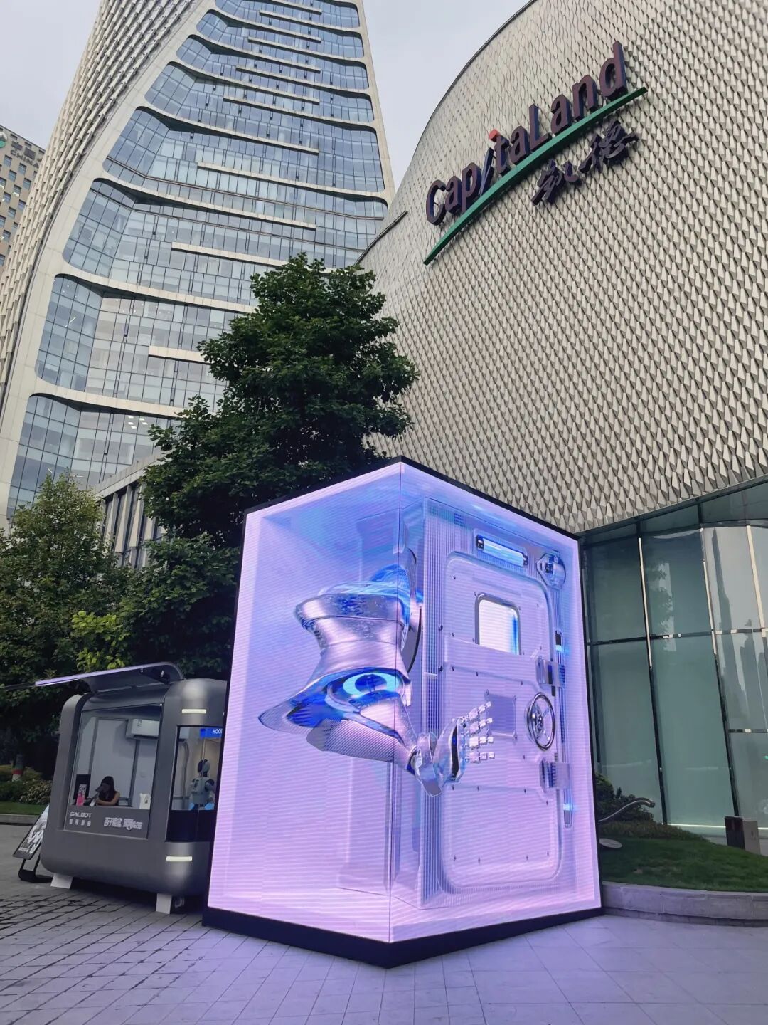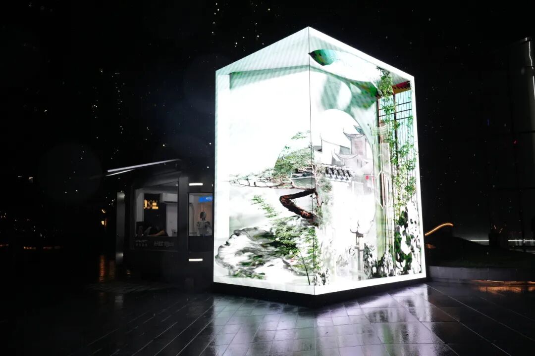 它有着和其他三兄弟一样的裸眼3D大屏,其余裸露的外观部分是赛博银色,就像一个银河太空舱,坐落在繁华商圈的街头。