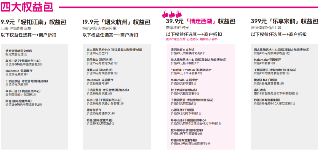 当然了,礼包本身就含有消费内容。例如39.9元的礼包,可从指定的清河坊冰箱贴、德寿宫下午茶、皋亭山饮品等商品中,任选一件获得,比直接购买更省钱。