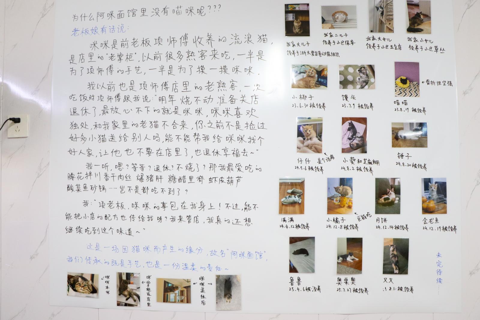 下午三点,午市的喧嚣刚刚落幕,晚市的准备工作又紧锣密鼓地开始了。老板娘笑盈盈地迎我们进店,跟我们分享店内布置的小巧思:“这个都是我自己写的。这些是我救助的小猫照片,有些领养出去了,有些我们就自己笑纳了。”