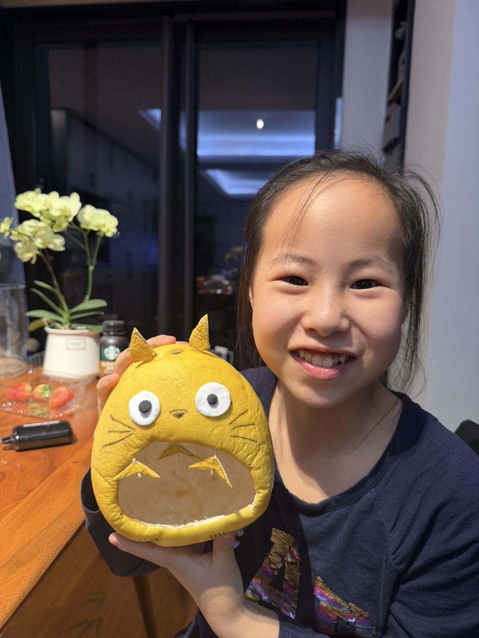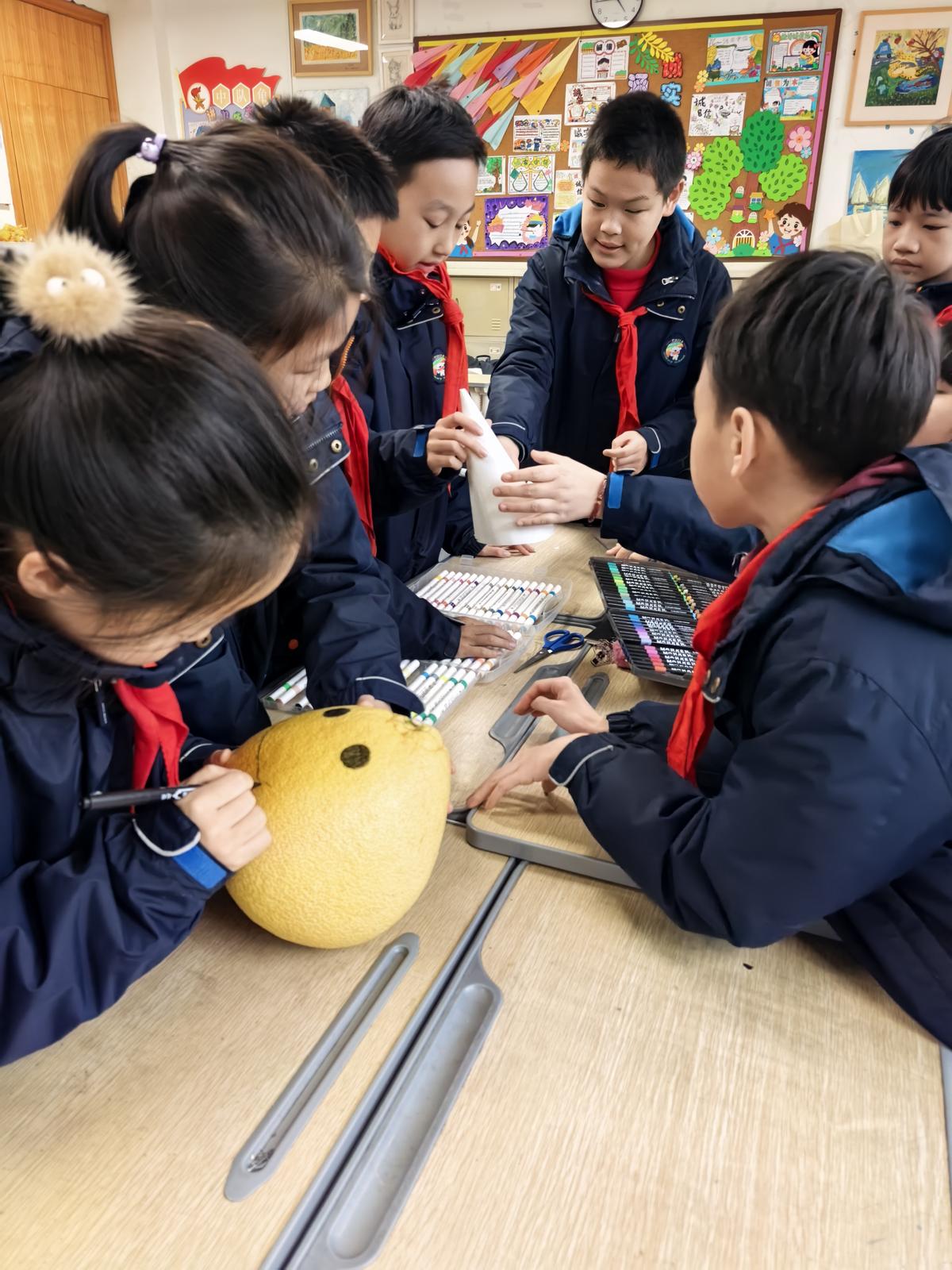 活动现场,一颗颗金黄的柚子被摆放在桌面上,散发出淡淡的清香。同学们分成小组,开始了他们的“柚子创意之旅”。有的小组将柚子精心雕刻成憨态可掬的动物造型——胖乎乎的柚子熊猫、展翅欲飞的柚子小鸟、俏皮可爱的柚子兔子;有的小组则在柚子皮上创作精美图案,绘制出秋日丰收图、校园风景画;还有的小组将柚子制作成别具一格的灯笼,内部放置小灯串,营造出温馨浪漫的氛围。