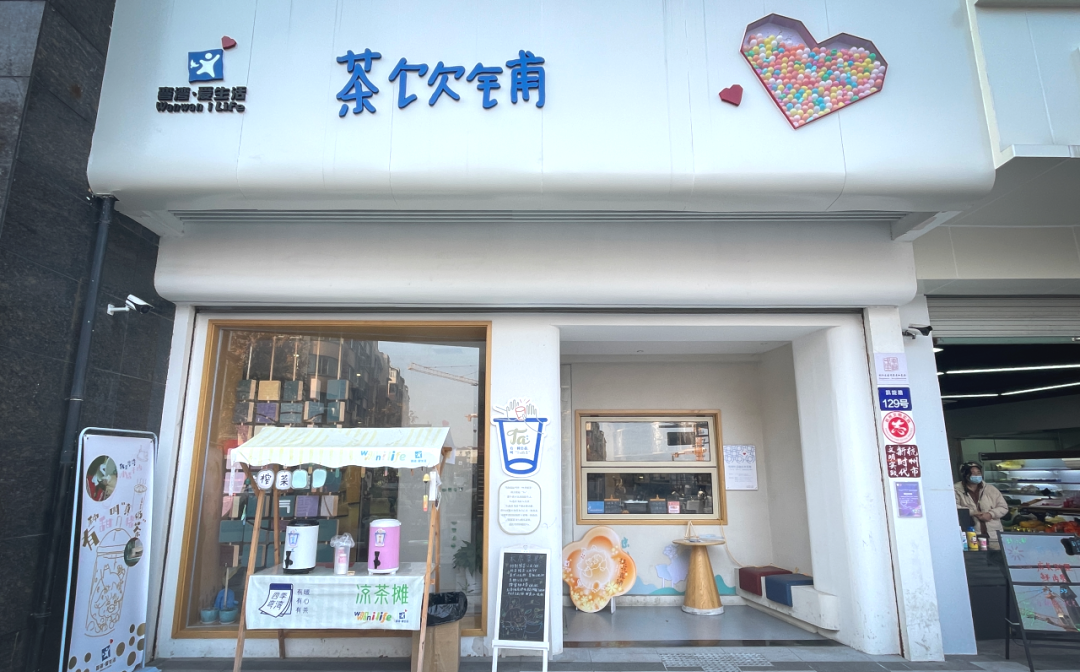 弯弯·爱生活茶饮铺内(荷湾暖新驿家)(地址:上城区凯旋路129号)。