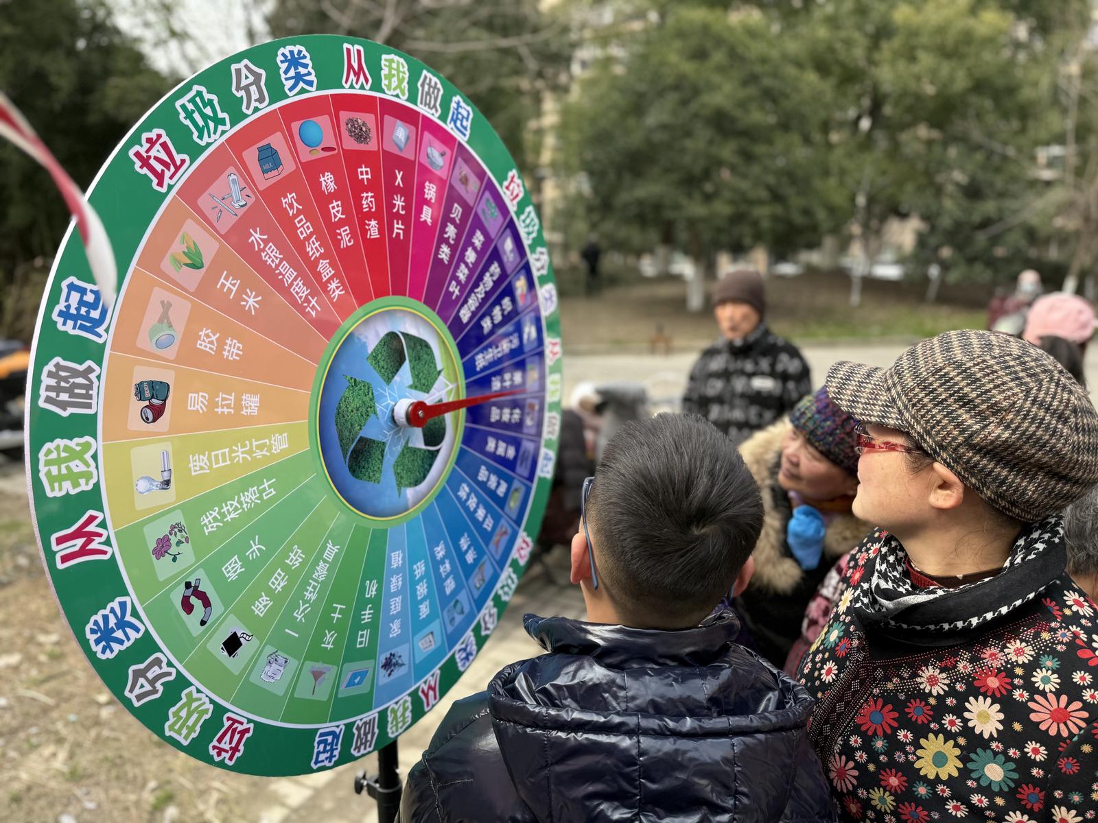 垃圾分类知识普及区以趣味转盘形式成为焦点。居民通过转动分类知识转盘回答相关问题,答对即可兑换无花果、汽水等7080后怀旧零食。欢声笑语中,垃圾分类知识悄然入心。许多家长带着孩子一同参与,让环保意识在寓教于乐中深植童心,实现了绿色理念的生动传承。