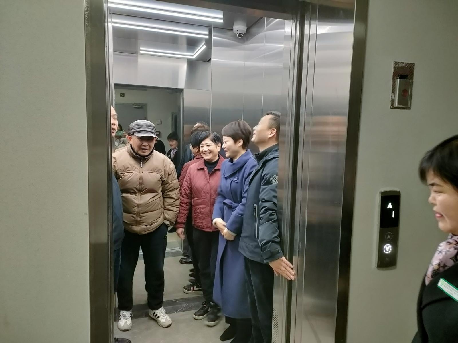 致辞结束后,陈轶聃副主任与居民代表一同前往西苑小区单元楼,实地体验全新升级的智能电梯。他亲手按下呼叫按钮,电梯门平稳开启,轿厢内宽敞明亮。抵达顶层后,陈轶聃副主任仔细查看电梯运行状态,向奥的斯机电工作人员询问设备安全保障与后期维保细节,并与同行的居民交流体验感受:“新电梯运行平稳、设计贴心,真正解决了老旧小区居民的出行痛点。”