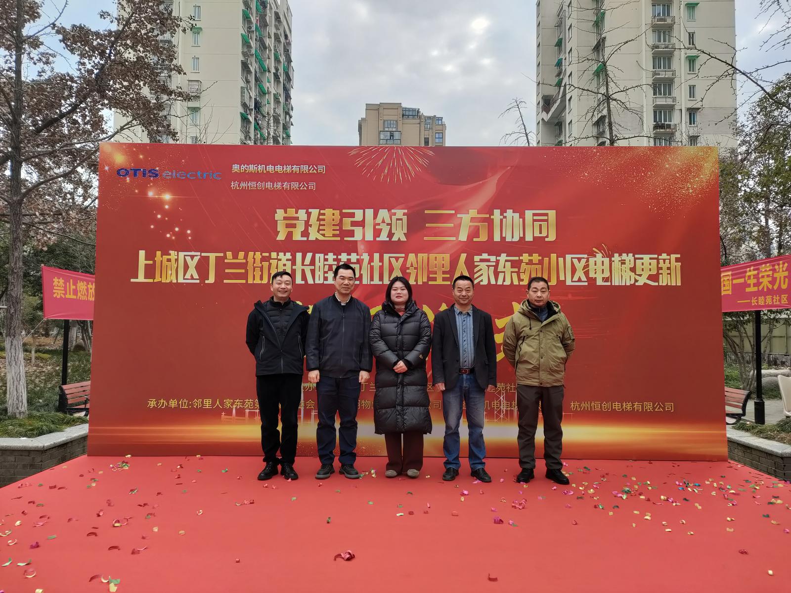春临福邸,梯载民心。2026年2月4日,邻里人家西苑、东苑小区先后迎来电梯更新项目竣工交付仪式。上午9时,西苑小区内红毯铺就,彩带飘扬,“电梯焕新”的主题展板熠熠生辉;10时许,东苑小区的交付现场同样掌声雷动,丁兰街道办事处副主任陈轶聃莅临,社区党委、小区业委会、物业企业、奥的斯机电厂家和安装公司代表及小区居民代表齐聚一堂,共同见证这一民生工程的圆满收官,标志着两小区超16年“服役”的老旧电梯正式“退役”,62台全新奥的斯智能电梯同步投入使用,为1978户居民的“上下出行”注入稳稳的幸福。