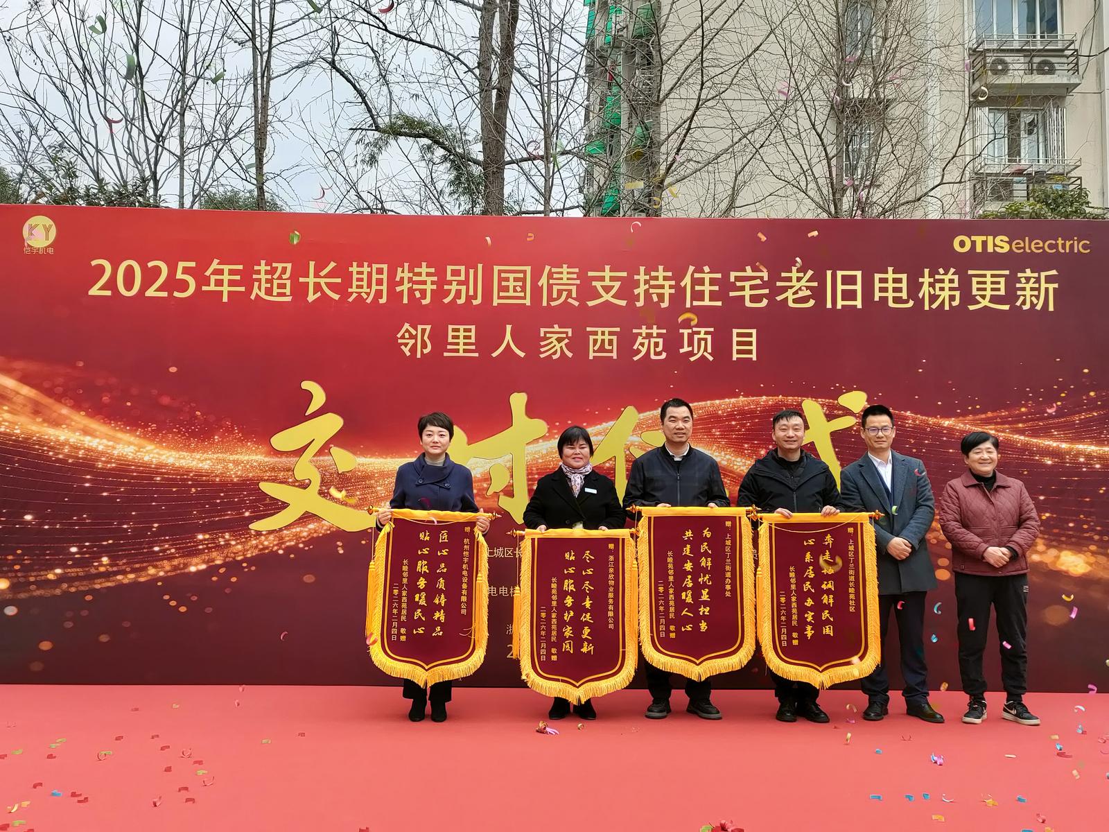 “电梯换新不仅是设备的升级,更是社区治理能力的试金石。”社区党委书记叶彬在交付仪式上表示,此次项目的圆满落地,是多方协同共治的生动实践,更是以民生需求为导向的治理答卷。 交付仪式现场,小区业委会代表业主和在住居民向街道、社区、物业企业及电梯安装施工方赠送了写有“为民解忧显担当,共建安居暖人心”“....”等四面锦旗,锦旗上的烫金大字,正是对这项民心工程的最高赞誉。据悉,此次电梯更新项目每台电梯争取到了国家超长期国债专项补贴15万元、杭州市政府补贴2万元,补贴资金的下拨,对于经适房邻里人家东西苑的居民来说,就像一场及时雨。极大地减轻了小区居民的压力,又确保了项目专项资金规范公开透明的使用。